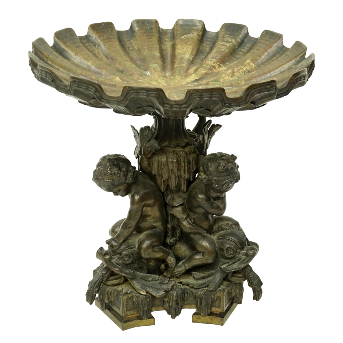 20th Century Bronze Three Cherub Figural Centerpiece/Compote. Unsigned. Measures 13-3/8" H x 12-5/8" W. Condition: Rubbing to surface otherwise good condition Domestic Shipping: Third party Min Est. $600.00 Max Est. $800.00