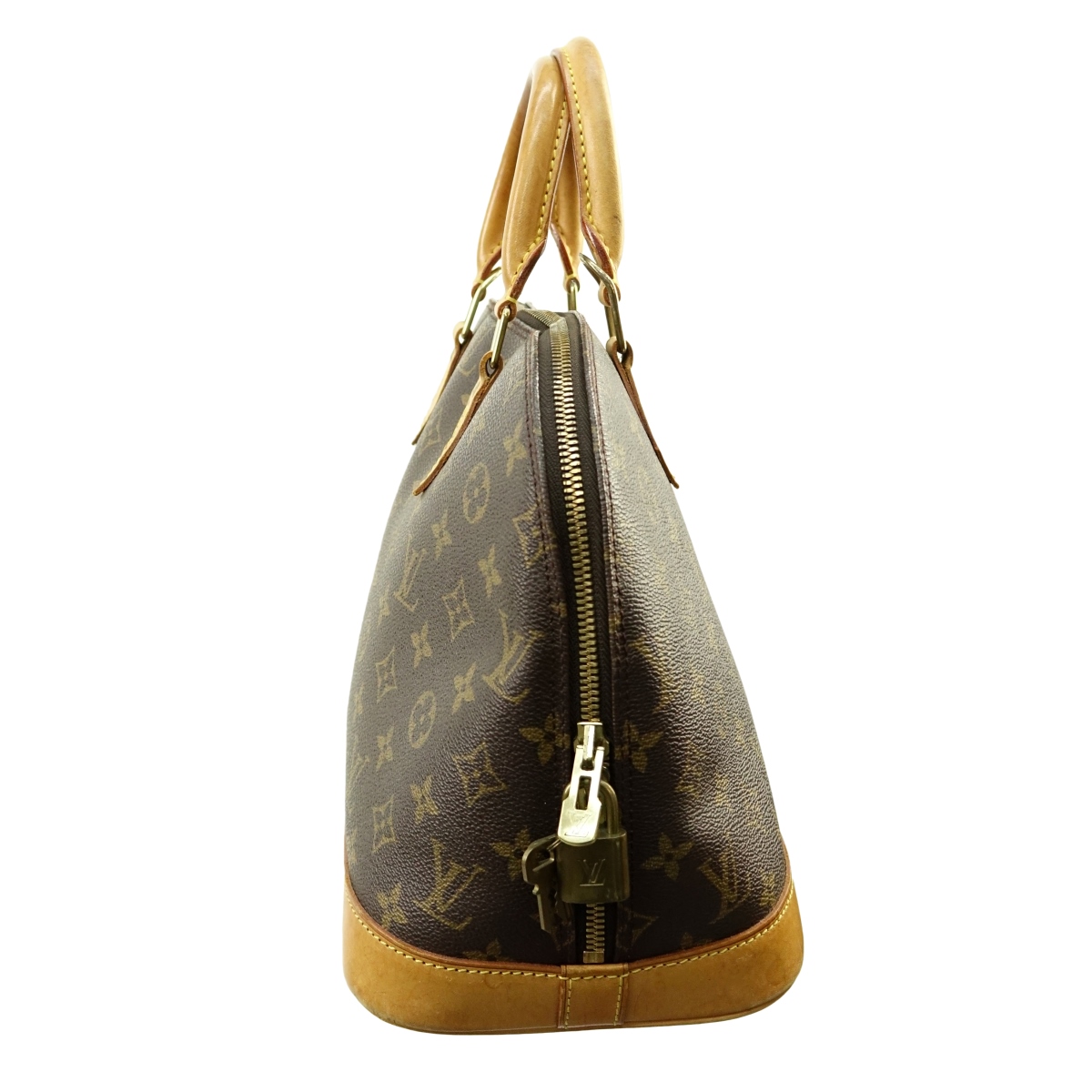Louis Vuitton Brown Canvas Monogram Alma PM. Golden brass hardware, brown interior with slot and patch pockets, vachetta handles. Cadenas, Keys, Dustbag included. Labeled appropriately. Serial #AR0959. Measures 12" x 9-1/2" x 6-1/2". Condition: Good pre-owned condition, with toning, wear and stains on vachetta from use. Domestic Shipping: $58.00 Min Est. $400.00 Max Est. $500.00