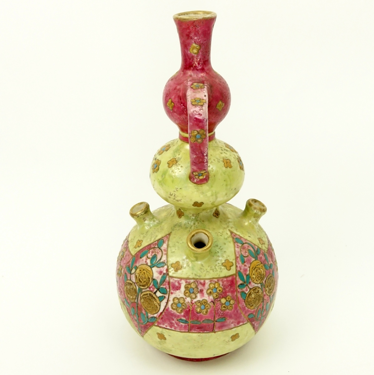 Paul Dachsel Art Nouveau Amphora Two Handled Vase with Four Spouts. impressed Austria Amphora mark to base and numbered. Measures 13-1/2" H x 6-1/2" W. Condition: Rubbing Domestic Shipping: $115.00 Min Est. $200.00 Max Est. $400.00