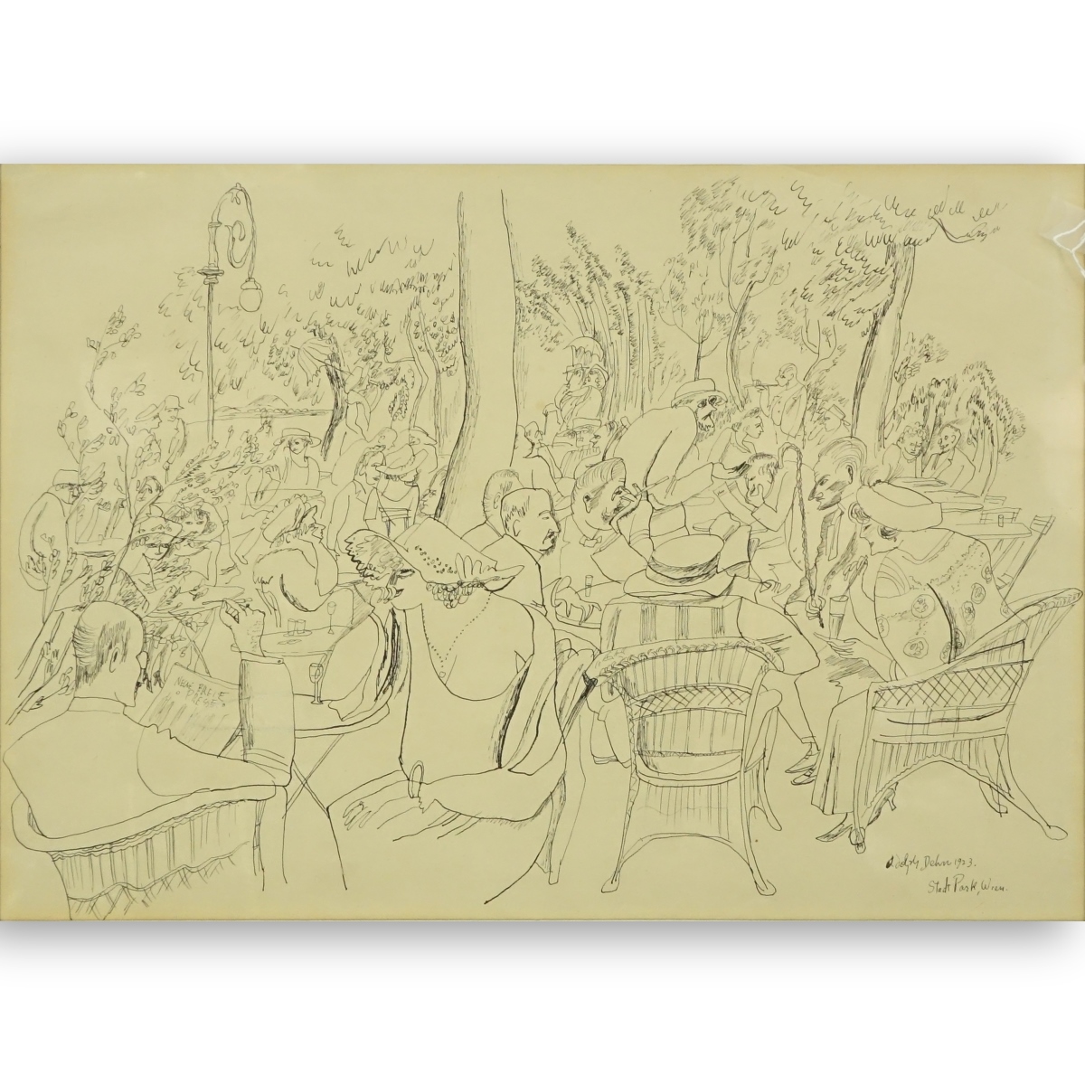 Adolf Dehn, American (1895 - 1968) Ink on Paper "Stadt Park, Wein" Signed, Dated 1923, and Titled on Lower Right. Number APG6299D. Gallery labels attached en verso. Measures 14" H x 19" W, frame measures 21" H x 26-1/2" W. Condition: Good condition Domestic Shipping: $145.00 Min Est. $400.00 Max Est. $600.00