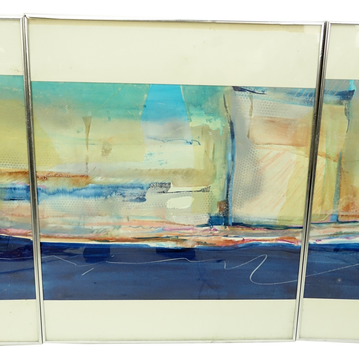 Harold E. Larsen (AMERICAN, 1935), Mixed Media on Paper Triptych, Abstract. Unsigned, artist's label to verso. Center measures 19" H, 22-1/2" W; frame measures 28-1/2" H, 23-1/4" H. Condition: Good condition. Domestic Shipping: Third party. Min Est. $100.00 Max Est. $200.00
