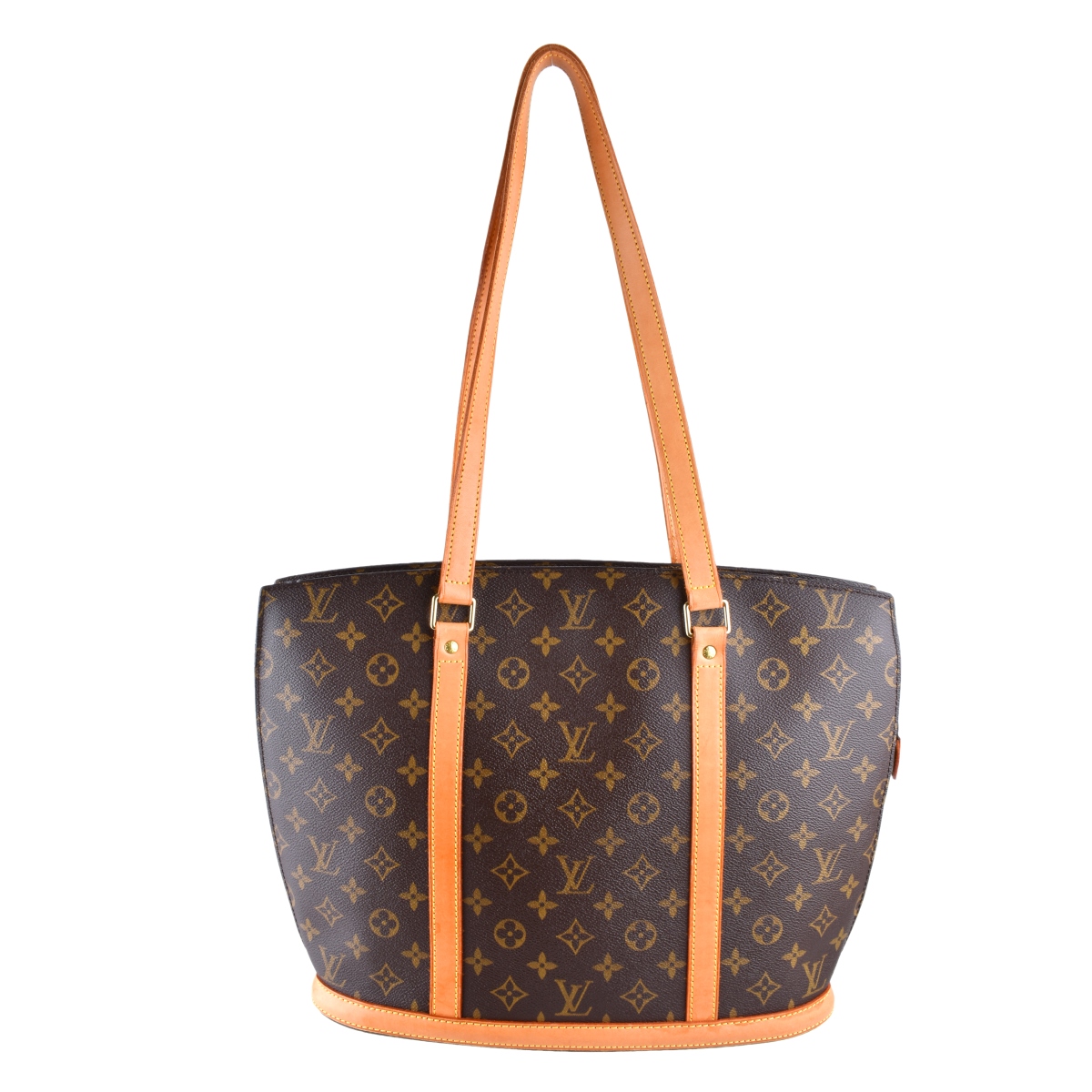 Louis Vuitton Brown Canvas Monogram Babylone Tote. Golden brass hardware, beige interior, vachetta Handles and bottom. Labeled appropriately. Serial #VI0967. Measures 16" x 12-1/4" x 4-1/2". Condition: Pre-owned good condition with toning and light stains on vachetta. Domestic Shipping: $68.00 Min Est. $400.00 Max Est. $500.00
