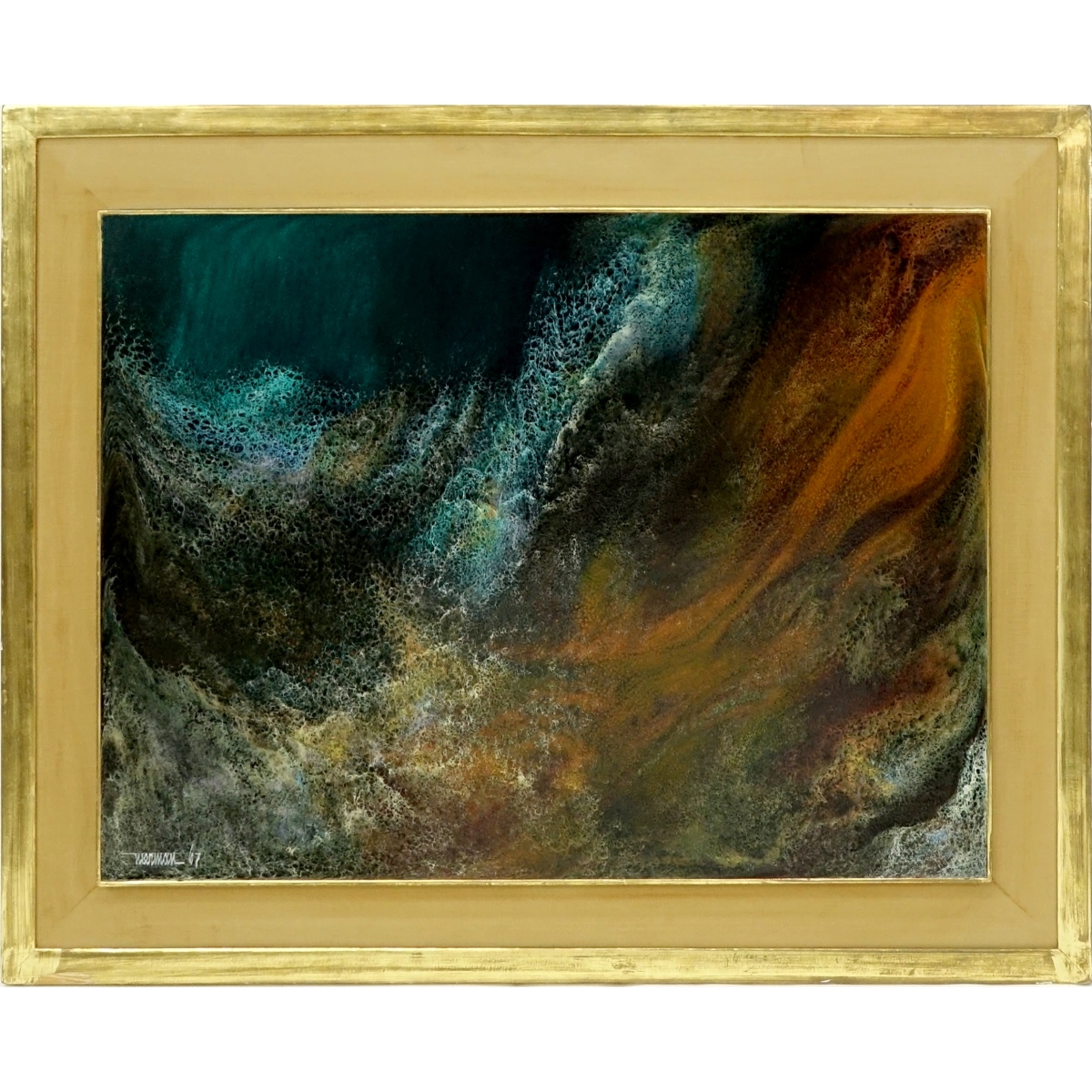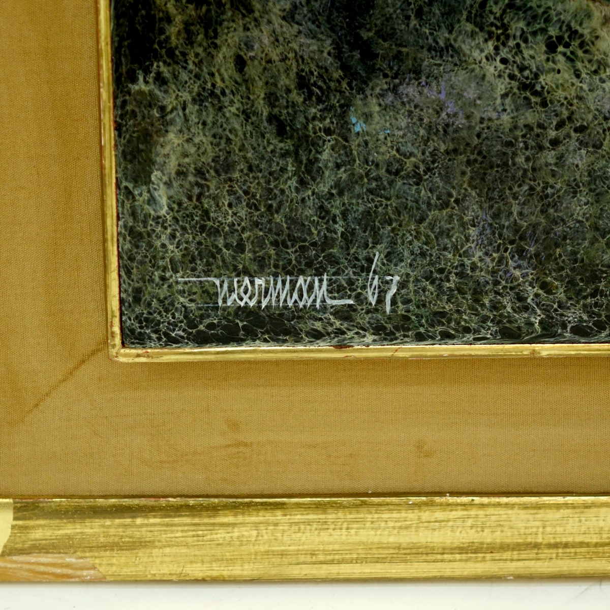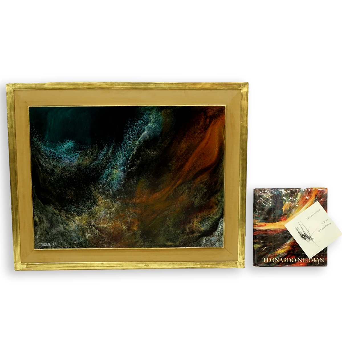Leonardo Nierman, American/Mexican (born 1932) Oil on Masonite, Abstract Composition, Signed and Dated 1967 Lower Left. Together with an original hardcover book and disk. Measures 23-1/2" H x 31-1/2" W, frame measures 31-1/4" H x 39" W. Condition: Good condition Domestic Shipping: Third party Min Est. $1500.00 Max Est. $2500.00