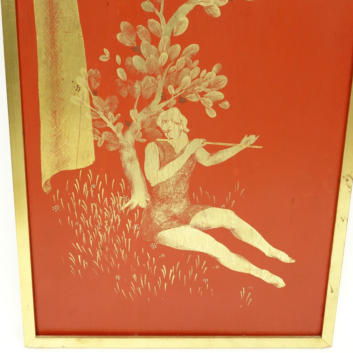 Mid 20th Century Possibly Italian Gilt Painted Lacquer Panel. Unsigned. Measures (with frame) 54-1/2" H, 16-1/2" W. Condition: Rubbing, craquelure to lacquer surface Domestic Shipping: Third party. Min Est. $200.00 Max Est. $300.00