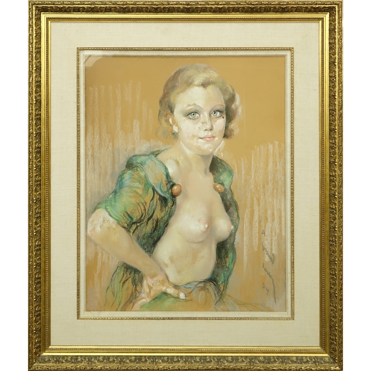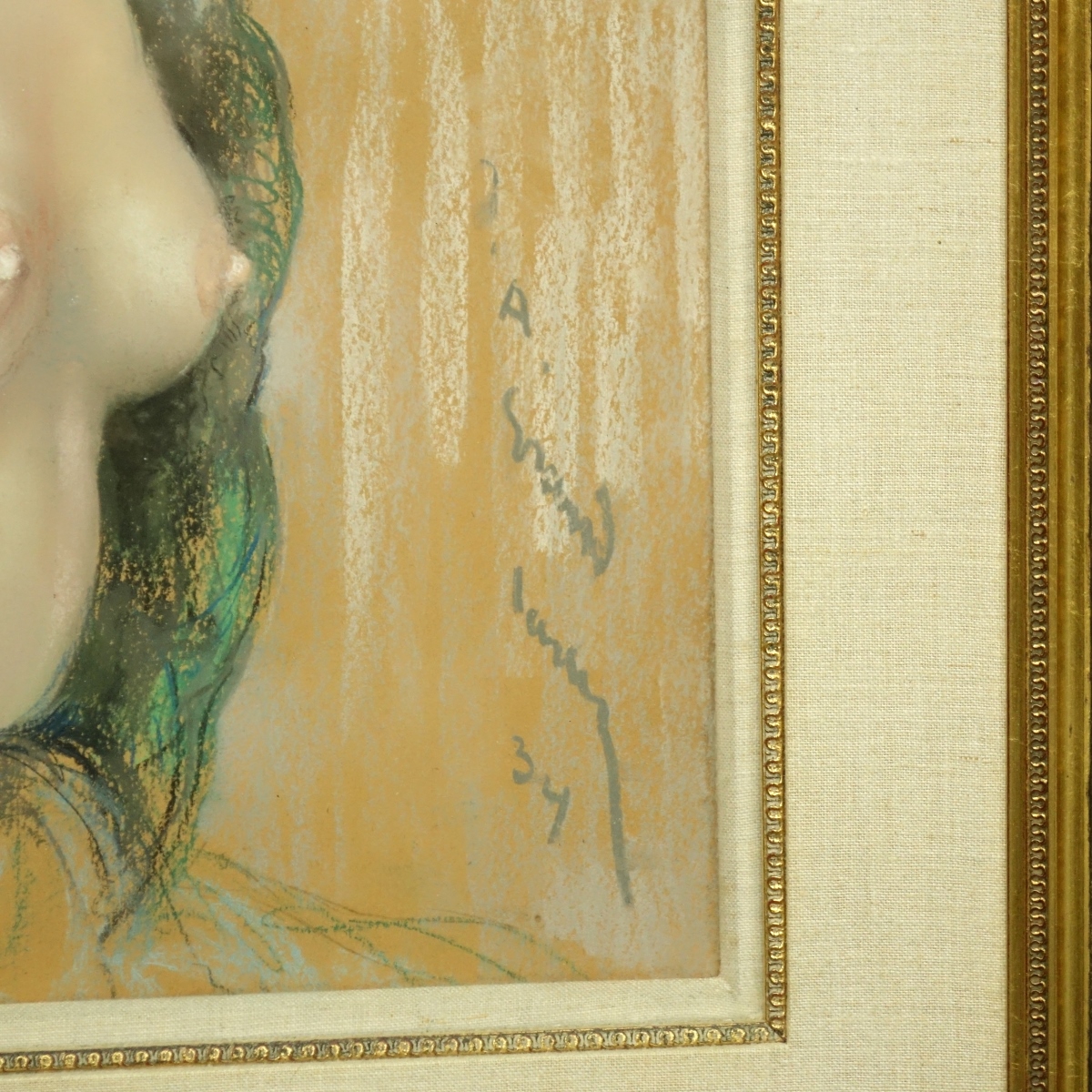 20th Century American School Pastel, Nude. Signed (illegible) and dated '34. Measures 25" H, 19-1/4" W (sight); frame measures 35" H, 30" W. Condition: Flaking / rubbing to surface. Domestic Shipping: Third party Min Est. $200.00 Max Est. $300.00