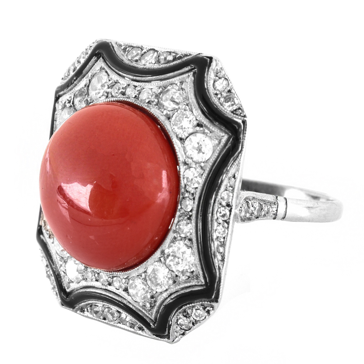 Art Deco Approx. 1.50 Carat Pave Set Old European Cut Diamond, Cabochon Red Coral, Enamel and Platinum Ring. Diamonds H color, SI1-SI2 clarity. Coral measures 13mm diam. Unsigned. Ring size 7. Approx. weight: 10.1 grams. Condition: Very good antique condition. Domestic Shipping: $28.00 Min Est. $3000.00 Max Est. $4000.00