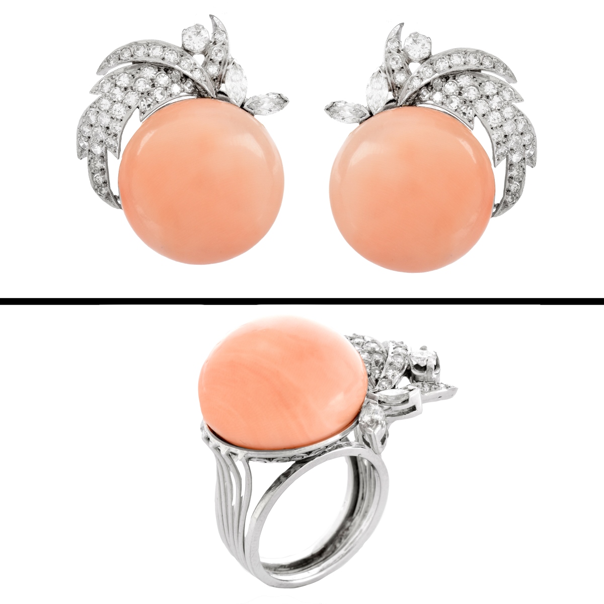 Vintage Angelskin Coral, Approx. 4.50 Carat Diamond and 14 Karat White Gold Ring and Earring Suite. Unsigned. Ring size 7; earrings measure 1-1/8" x 1". Approx. weight: 41.4 grams. Condition: Very good vintage condition. Domestic Shipping: $32.00 Min Est. $3500.00 Max Est. $4500.00
