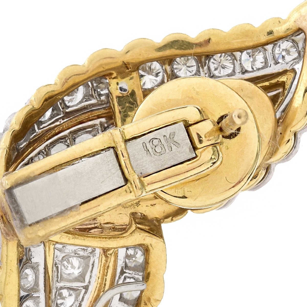 Vintage Approx. 6.0 Carat Round Brilliant Cut Diamond, Baroque Pearl and 18 Karat Yellow Gold Earrings. Diamonds F-G color, VS1-VS2 clarity. Pearls measure 13mm. Pearl is detachable. Stamped 18K. Measure 2-1/8" L, 3/4" W. Approx. weight: 36.9 grams. Condition: Very good condition. Domestic Shipping: $30.00 Min Est. $3500.00 Max Est. $4500.00