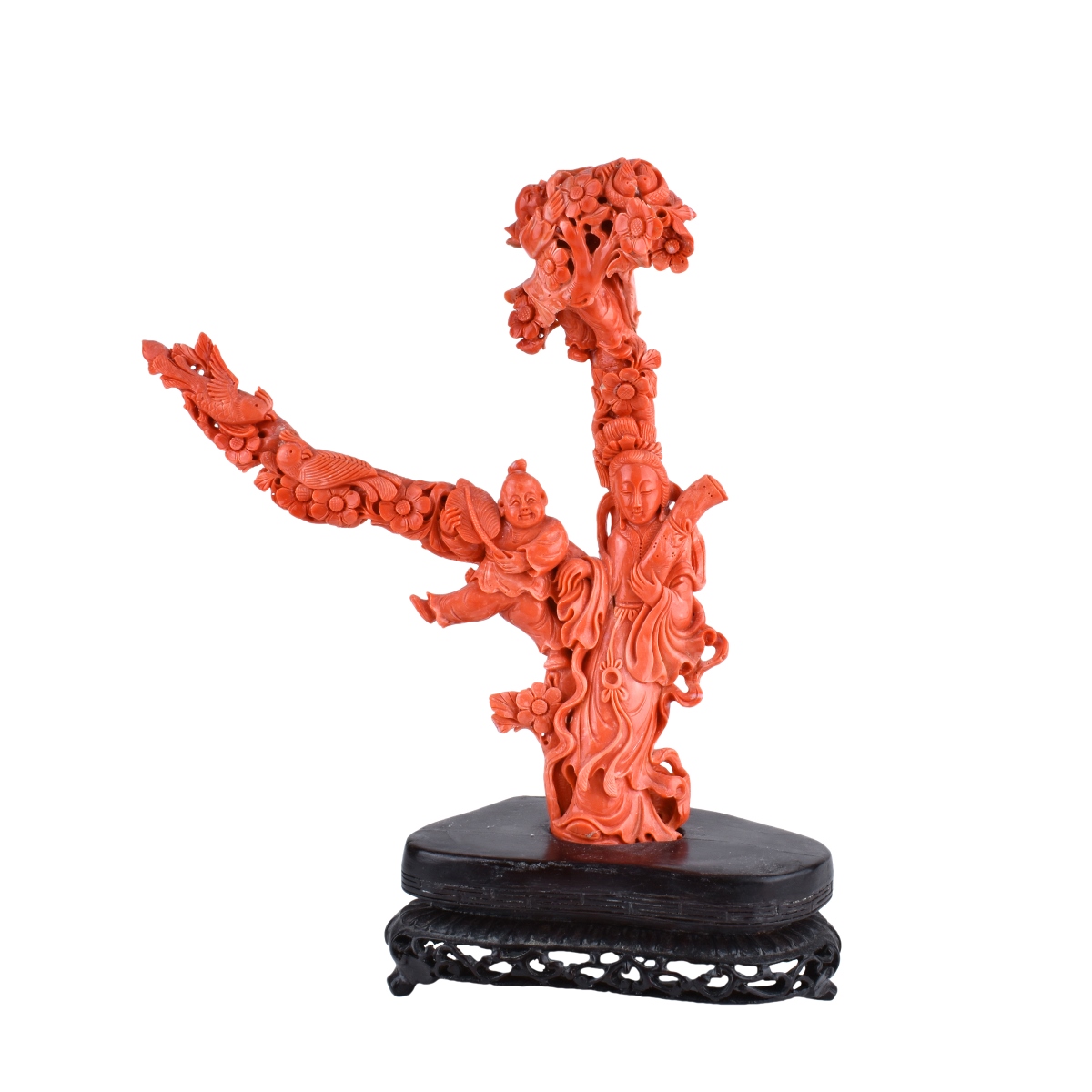 Superb Chinese Carved Pink Coral Group on Wooden Stand. Figures, birds, and foliage decor. Measures 10-1/2" H x 9" W. Condition: old professional restoration to branch otherwise good condition Domestic Shipping: $85.00 Min Est. $1200.00 Max Est. $1800.00