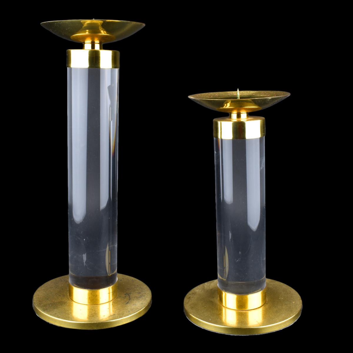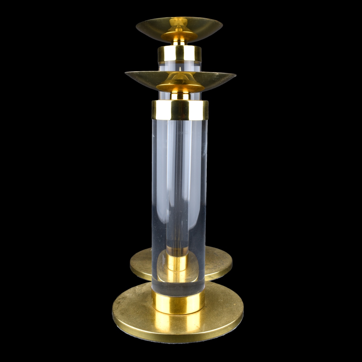 Karl Springer Lucite And Brass Tall Candleholders. Heavy. Unsigned. Measures 18" H and 14-1/4" H. Condition: In need of cleaning, polishing. Domestic Shipping: $135.00 Min Est. $200.00 Max Est. $400.00