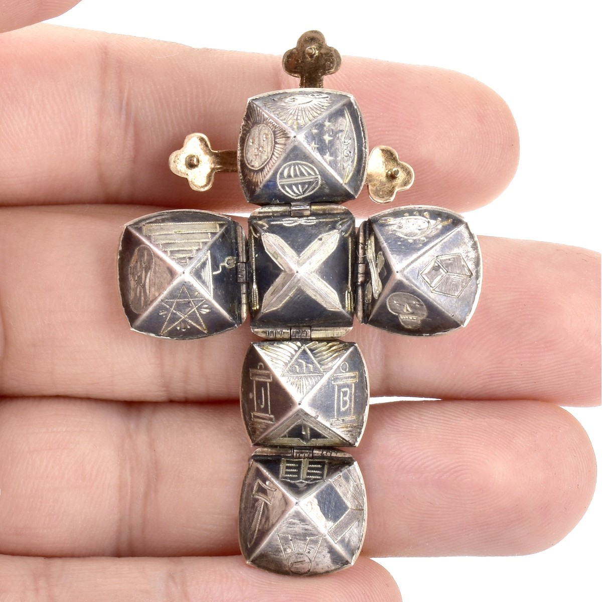 Antique 14 Yellow Gold and Silver Masonic Folding Cross Pendant. Unsigned. Measures (open) 2-1/4" L, 1-1/2" W; closed 7/8" x 7/8". Approx. weight: 12.8 grams. Condition: Good antique condition. Domestic Shipping: $28.00 Min Est. $100.00 Max Est. $200.00