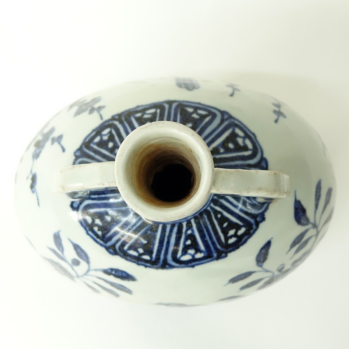Chinese Ming Dynasty Style Blue and White Porcelain Moon Flask Vase. Impressed mark to base. Measures 11" H x 8-1/2" W. Condition: Rubbing to handles otherwise good condition Domestic Shipping: $85.00 Min Est. $200.00 Max Est. $300.00
