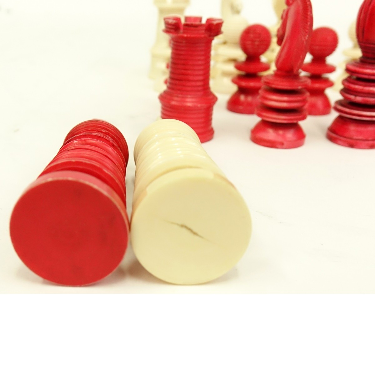 19th Century Staunton Ivory 32 Piece Chess Set. Wood box included. Natural and stained red pieces. Unsigned. Staunton box included. King measures 4" H. We Will Not Ship This Item Out of State of Florida. Anyone Having This Item Shipped Must Have a Florida Address or the Item will not be Shipped. We will Not Knowingly Sell Endangered Species outside of Legal Channels. Condition: Overall good condition with Overall good with light wear from age and use. Small repair to collar of one white pawn. Domestic Shipping: $62.00 Min Est. $1500.00 Max Est. $2500.00