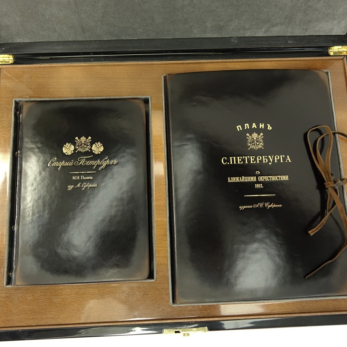 1912 History Of St. Petersburg Russia Book And Map in Presentation Case. Leather bound book and folding map. In fitted box. Case measures 2-3/4" H x 19-1/2" L x 14" D. Condition: Light wear and toning to book and map., Light scuffs on case. Overall very good condition. Domestic Shipping: $145.00 Min Est. $2000.00 Max Est. $3000.00