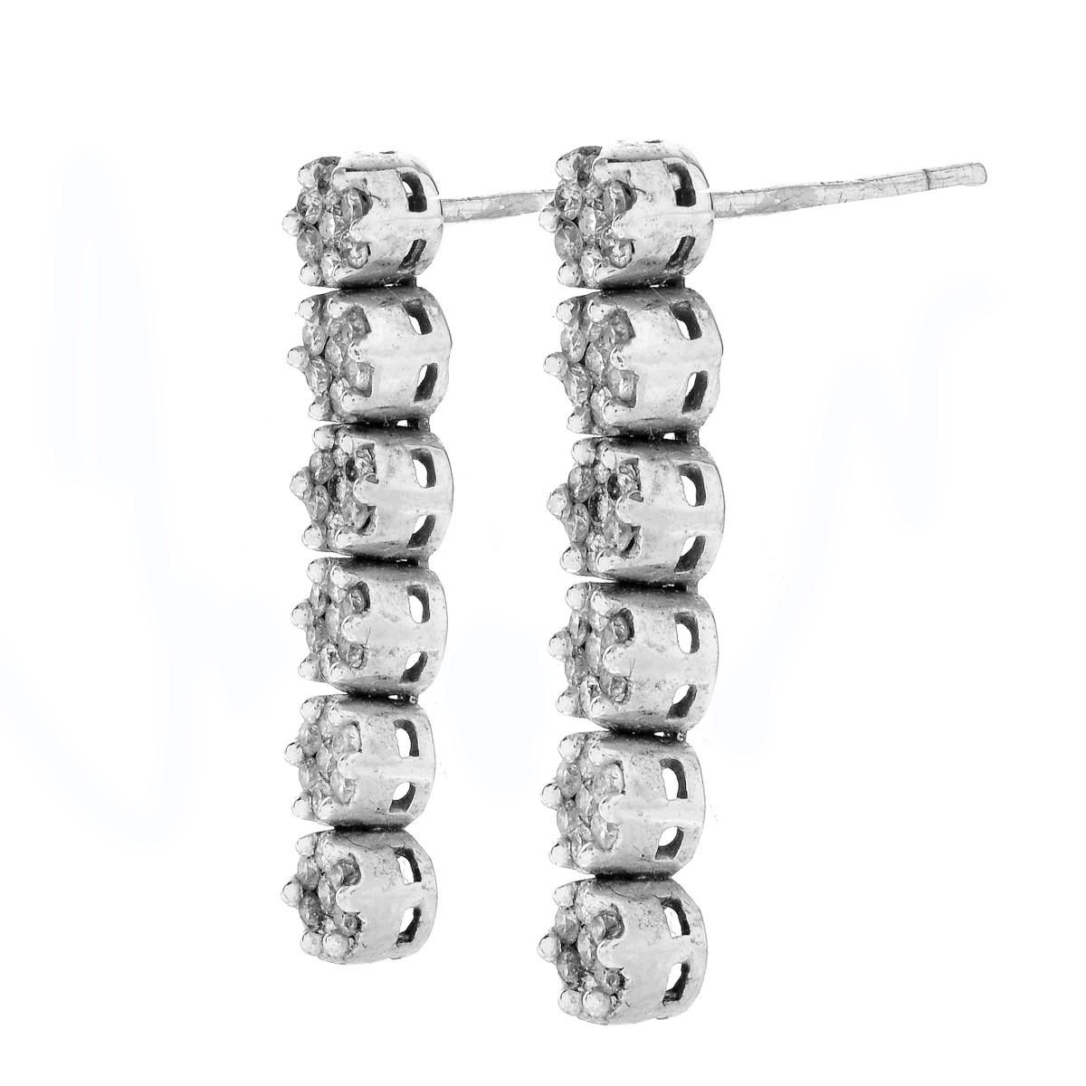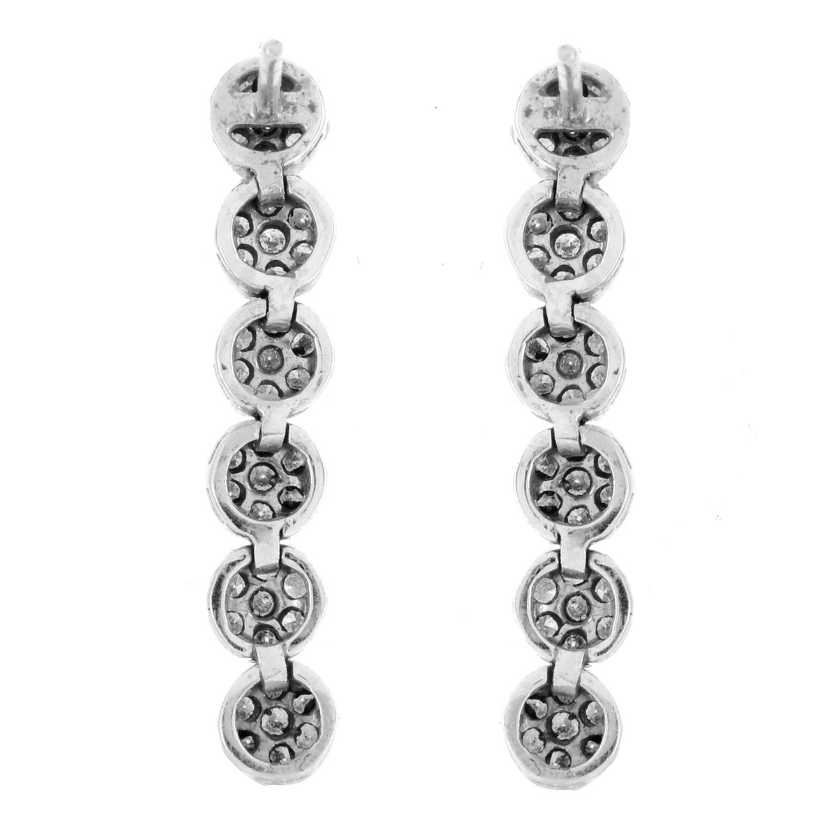 Diamond and 14 Karat White Gold Earrings. Unsigned. Measure 1-1/8" L, 1/8" W. Approx. weight: 5.5 grams Condition: Good condition. Domestic Shipping: $28.00 Min Est. $100.00 Max Est. $150.00
