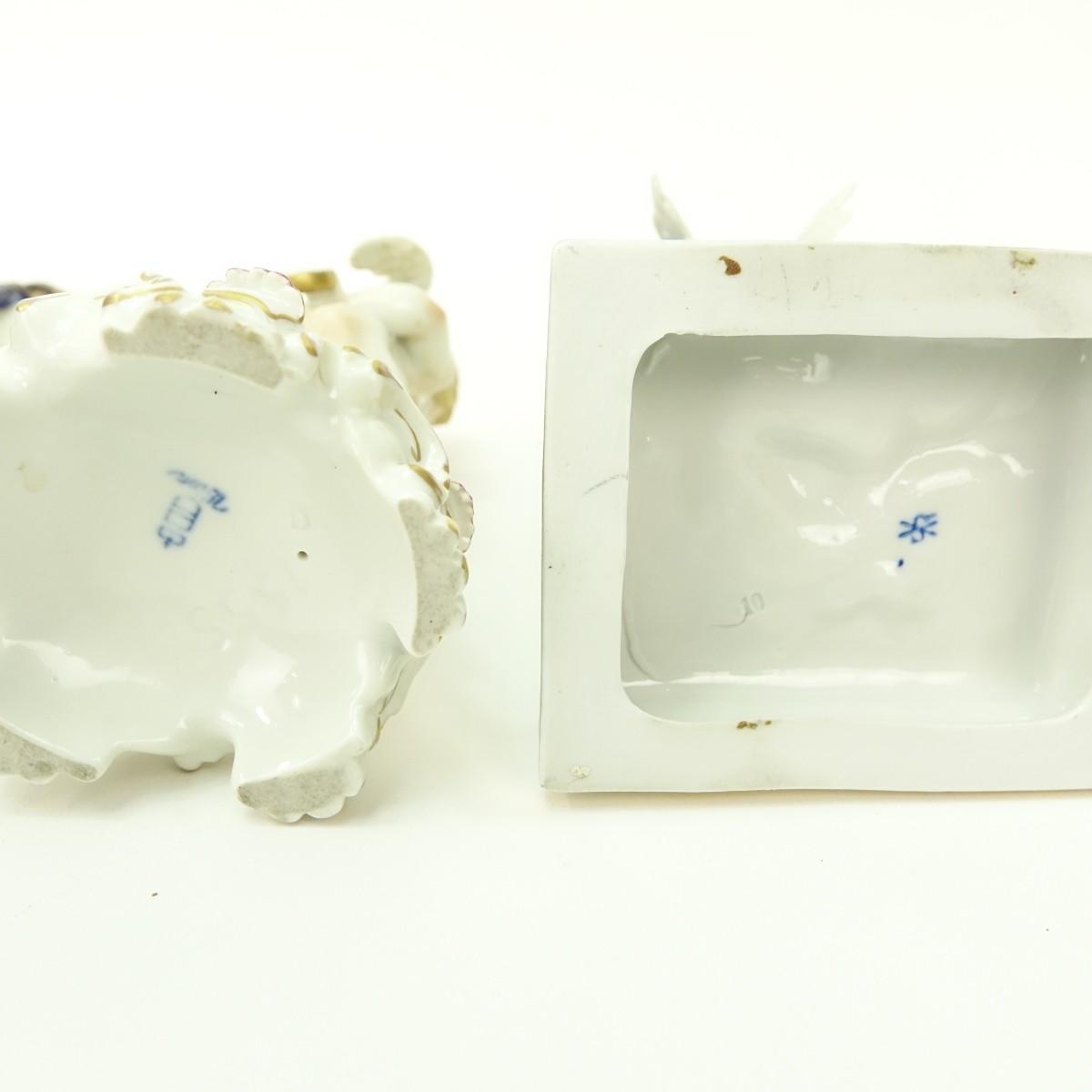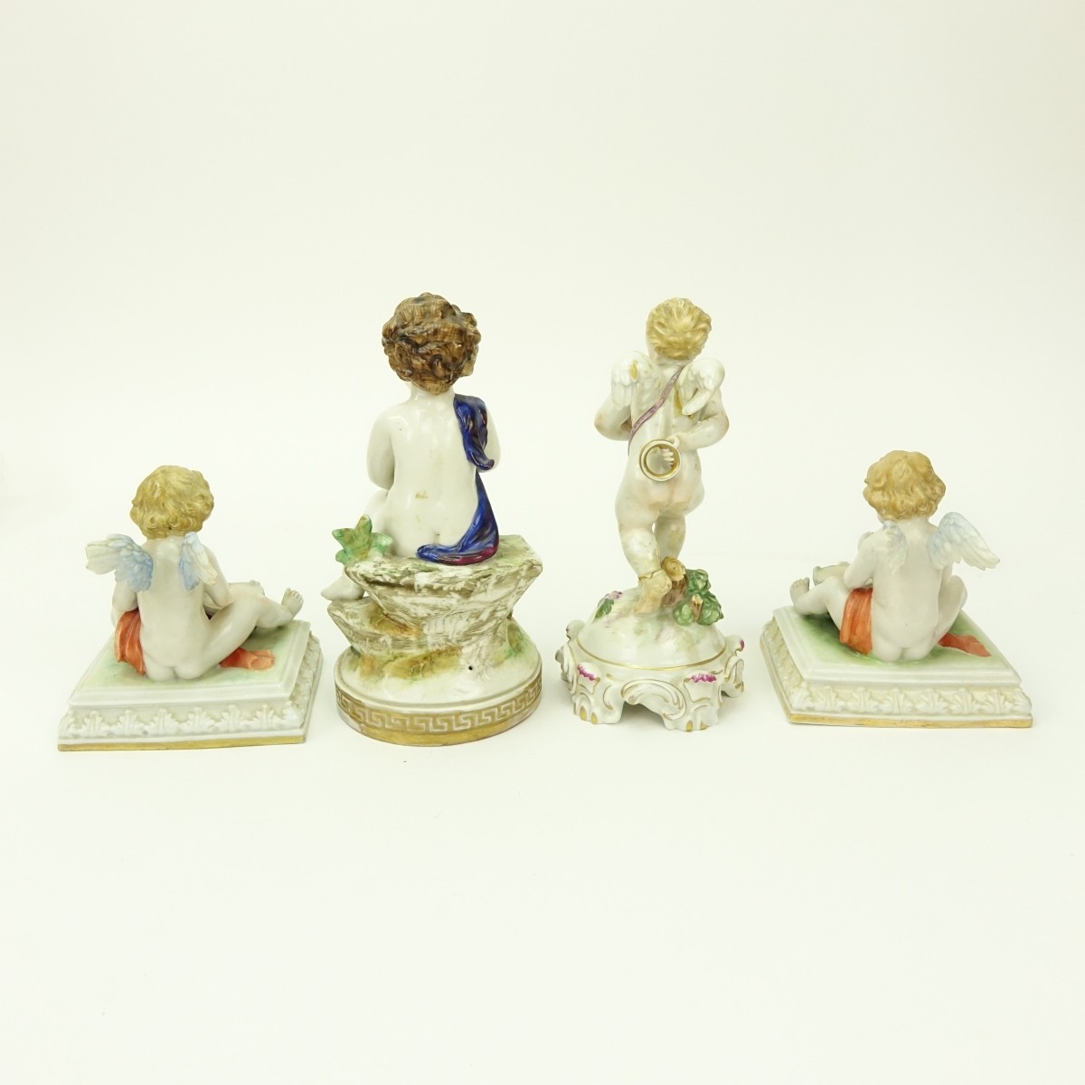 Grouping of Four (4) Antique Porcelain Figurines. Each is signed to base. Largest measures 6-1/2" H, smallest measures 4-1/8" H. Condition: Chips and repairs. Domestic Shipping: $62.00 Min Est. $200.00 Max Est. $300.00