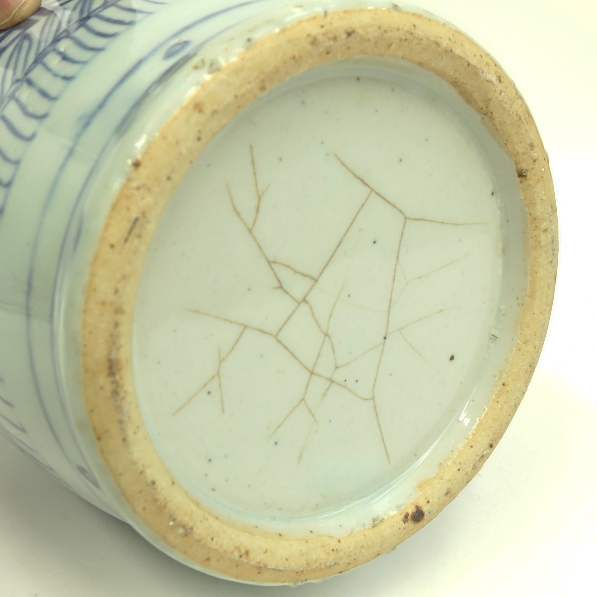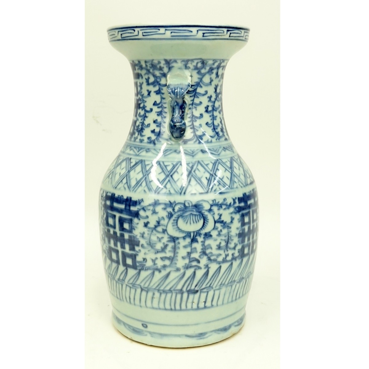Antique Chinese Blue & White Porcelain Handled Vase. Decorated with double happiness and lotus design. Associated stand included. Unsigned. Measures 13" H. Condition: Good overall condition with crazing on bottom. Small chips and hairline on rim. Domestic Shipping: $105.00 Min Est. $200.00 Max Est. $300.00