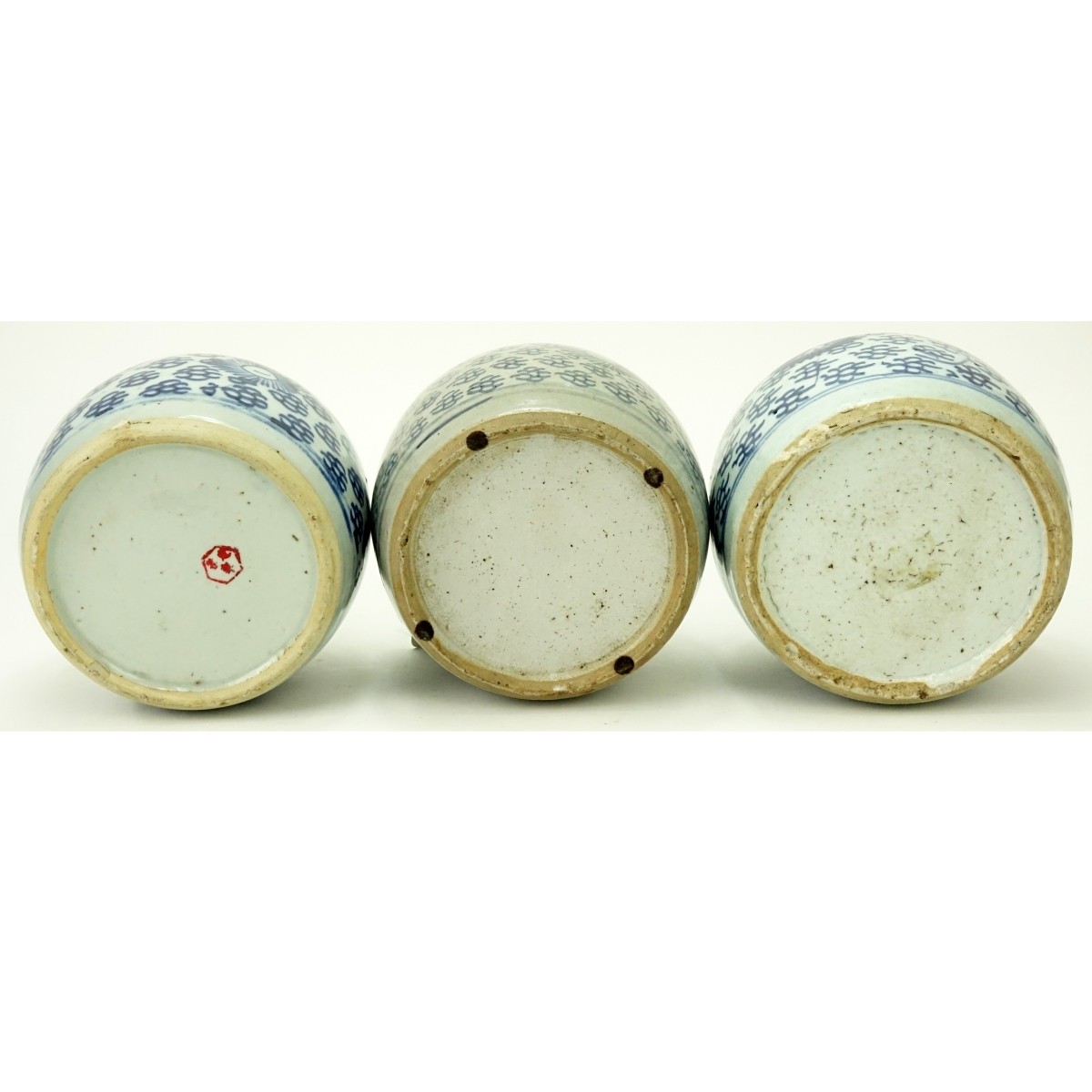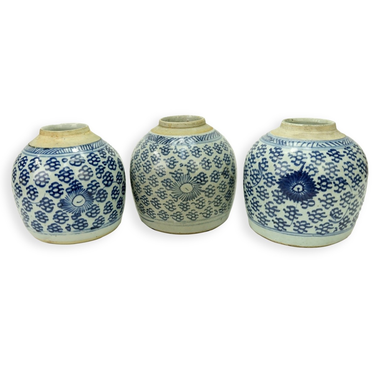 Three (3) Antique Chinese Blue & White Porcelain Jars. One with stamped mark, one with remnants of an import seal. Measures 6-1/4" H. Condition: Good condition with typical wear from age and use. Domestic Shipping: $75.00 Min Est. $200.00 Max Est. $250.00