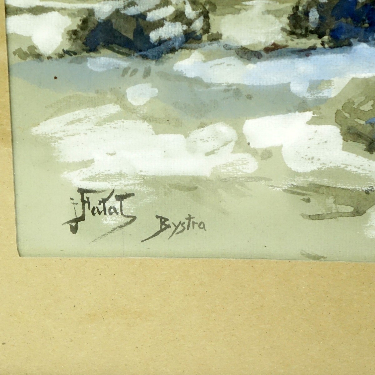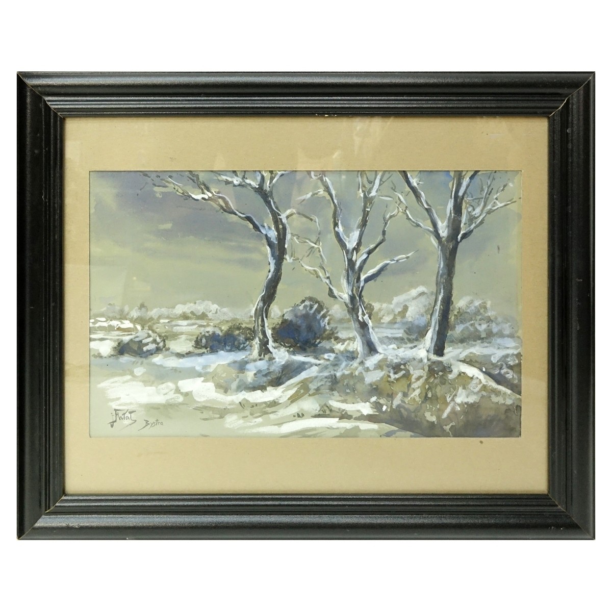 Julian Falat, Polish (1853-1929) Watercolor "Winter Landscape, Bystra" Signed lower left. Measures 11" x 17-1/2", frame measures 19-1/2" x 23-1/2". Condition: Toning, some foxing. Domestic Shipping: $165.00 Min Est. $400.00 Max Est. $600.00