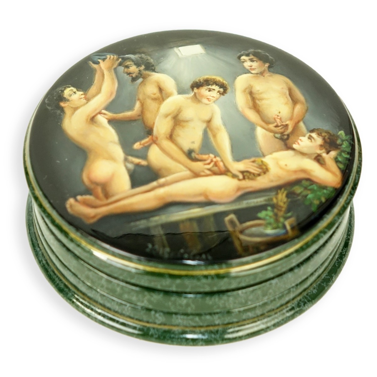 Russian Lacquered Three Part Paper Mache Box with Erotic Scenes. Signed. Features a different scene on each cover. Measures 1-1/4" x 3". Condition: Good condition. Domestic Shipping: $34.00 Min Est. $200.00 Max Est. $300.00