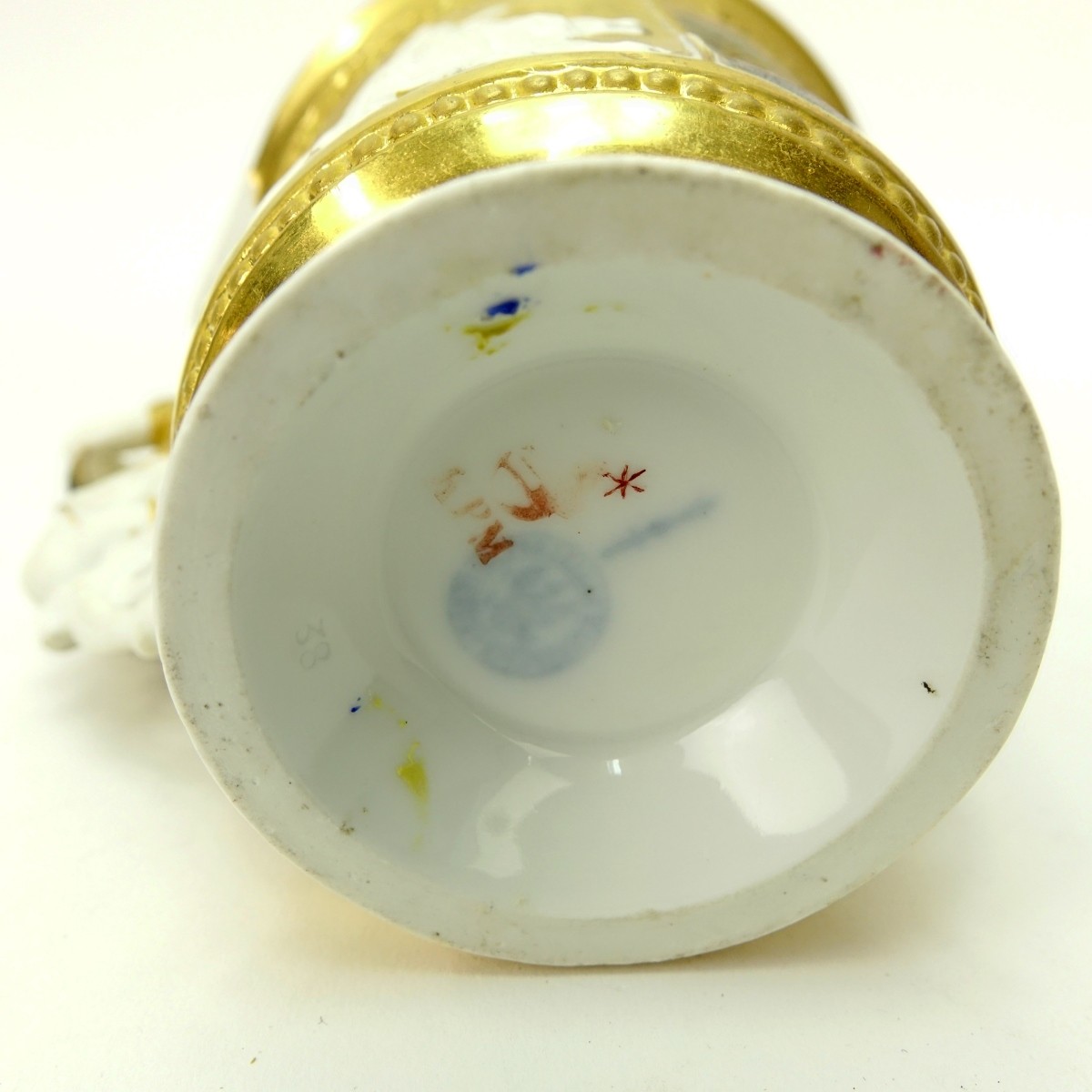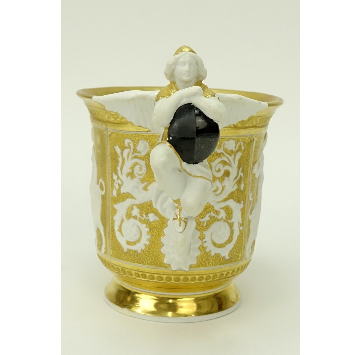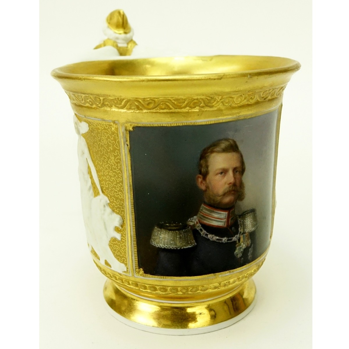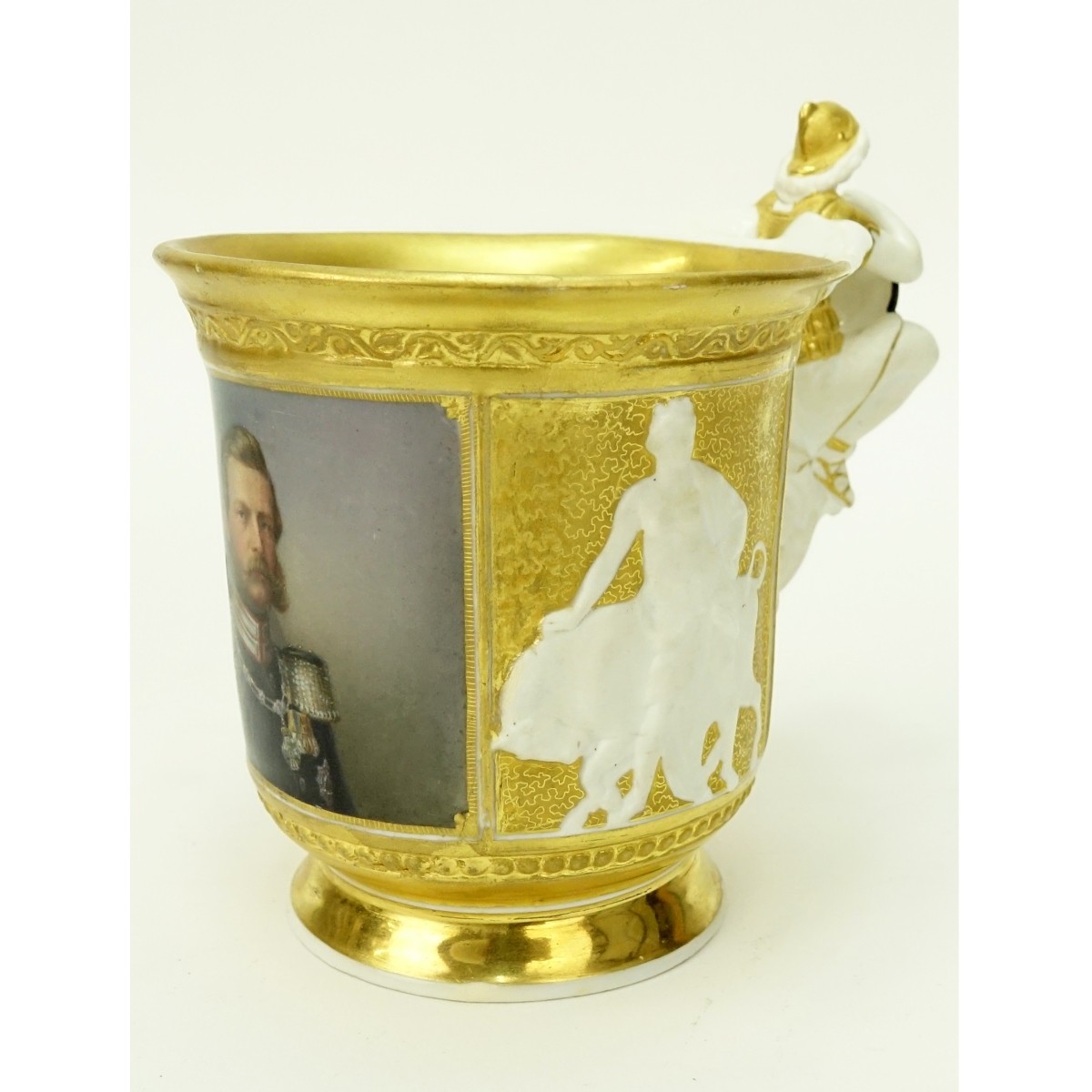 19th Century KPM Porcelain Portrait Cup. Decorated in gilt figural relief, the handle a full figure. Hand Painted portrait. Signed with blue underglaze mark and red KPM back stamp. Measures 4-1/2" H. Condition: Light wear to gilding. Tiny ding to edge. No cracks or repairs. Domestic Shipping: $65.00 Min Est. $1200.00 Max Est. $1400.00