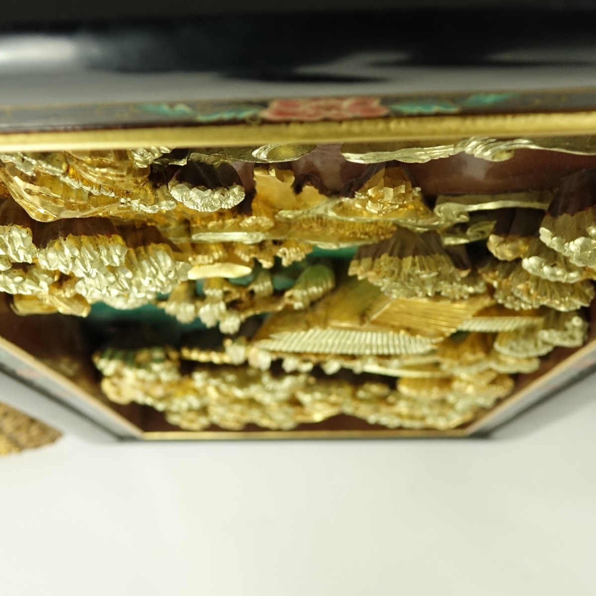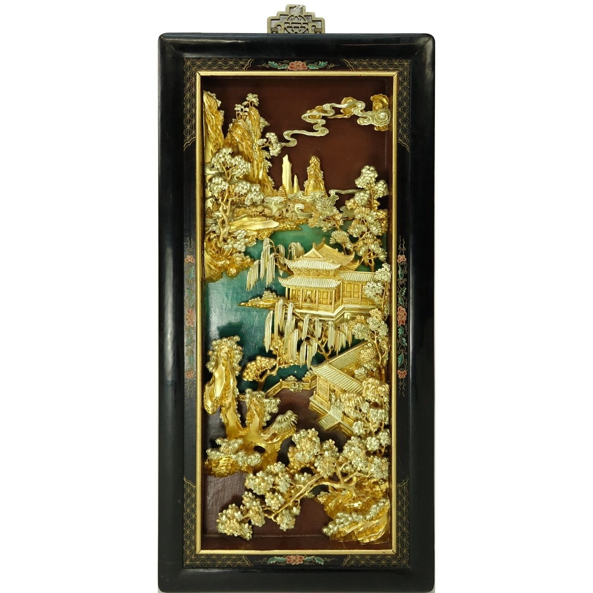 Mid-Century Chinese Carved Decorative Panel. Carved in high relief gilt wood a village scene. The lacquered frame decorated with hand painted decoration. Unsigned. Measures 32-1/4" x 16" Condition: Overall good condition with wear and rubbing. Domestic Shipping: $185.00 Min Est. $300.00 Max Est. $400.00