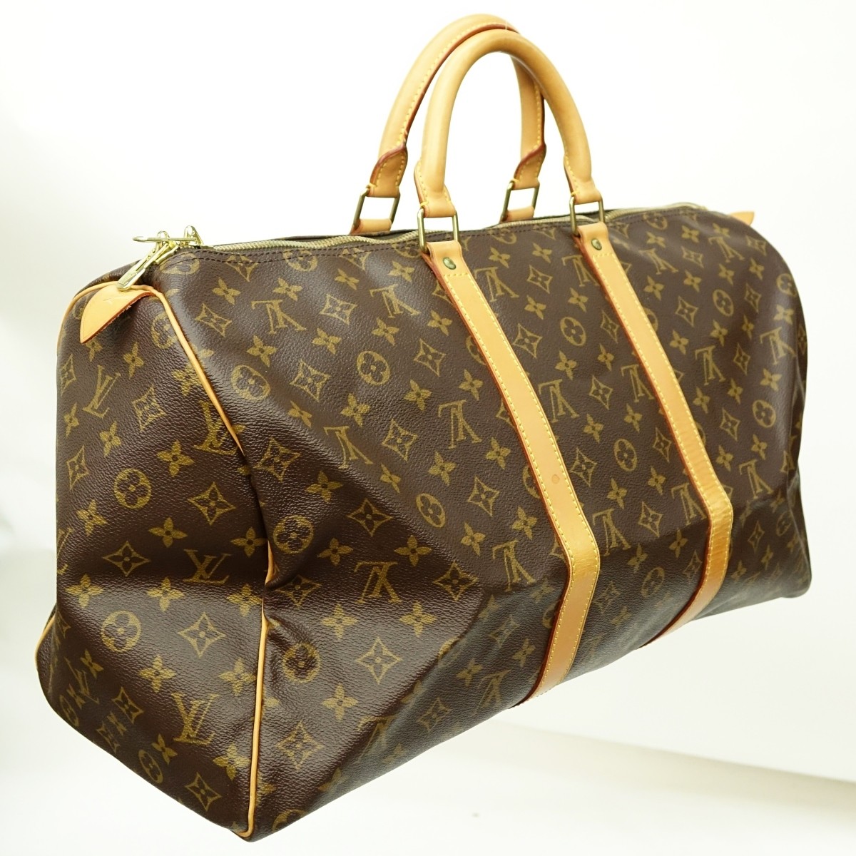 Louis Vuitton Brown Canvas Monogram Keepall 50 Travel Bag. Golden brass hardware, brown interior. Luggage Tag, Handle Strap, Keys, Cadenas included. Labeled appropriately. Serial #SP0965. Measures 19-1/2" x 10" x 8-1/2". Condition: Good pre-owned condition with toning, light stains and wear from use Domestic Shipping: $105.00 Min Est. $550.00 Max Est. $650.00