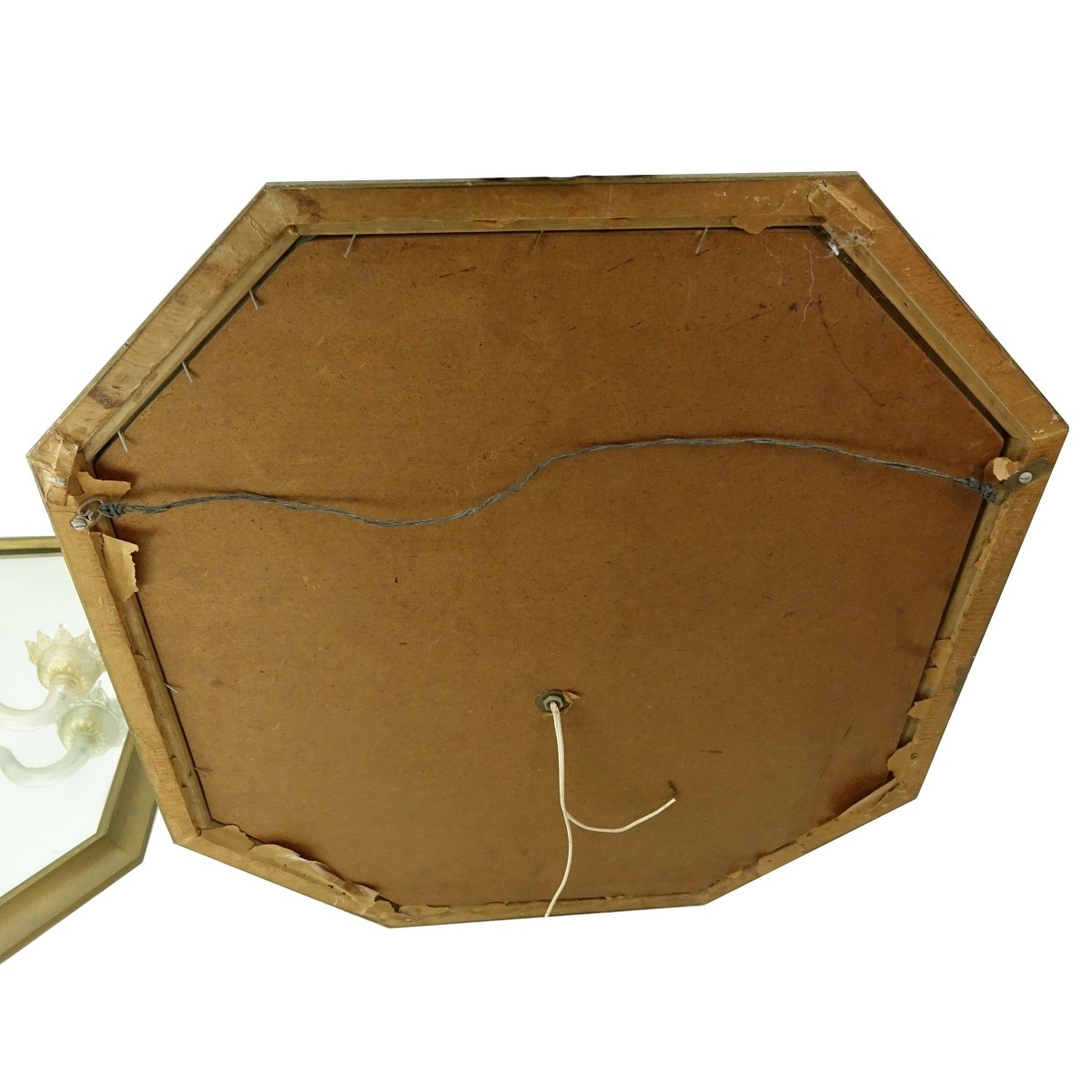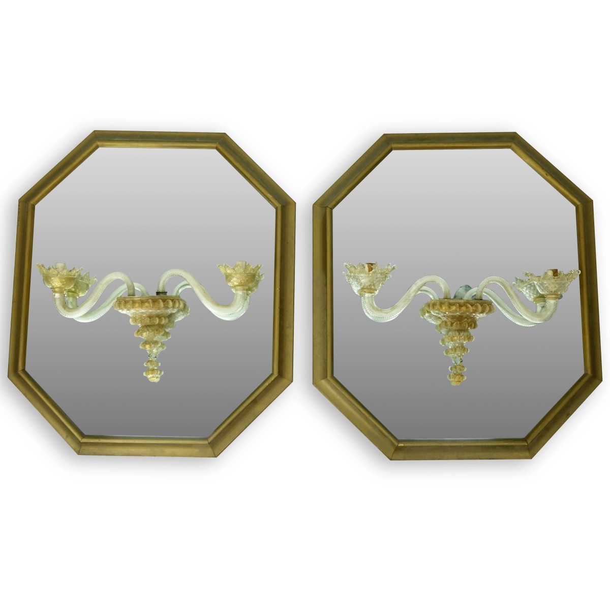 Pair of Vintage Venetian Glass Sconces Mounted On Mirrors. Unsigned. Mirrors measure 29" x 25". Condition: Typical wear, in need of cleaning. Domestic Shipping: Third party Min Est. $200.00 Max Est. $300.00