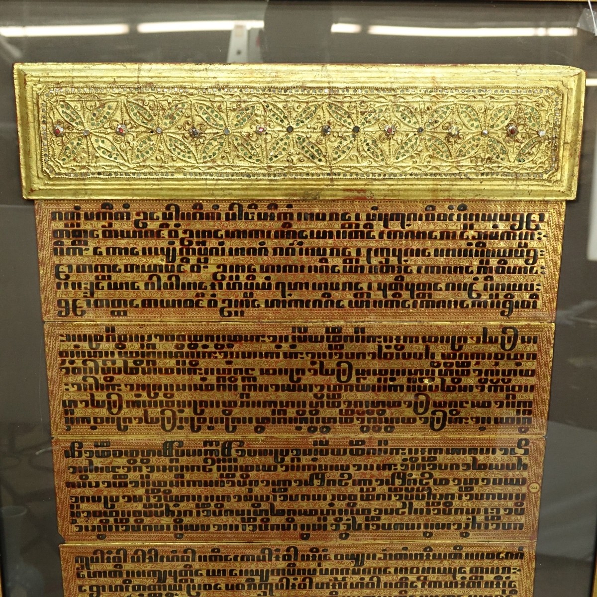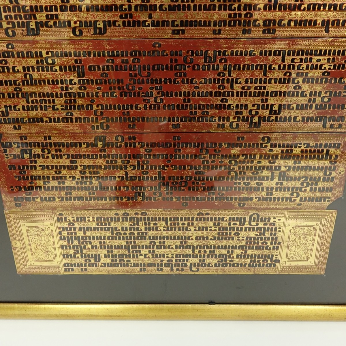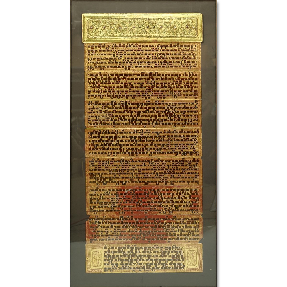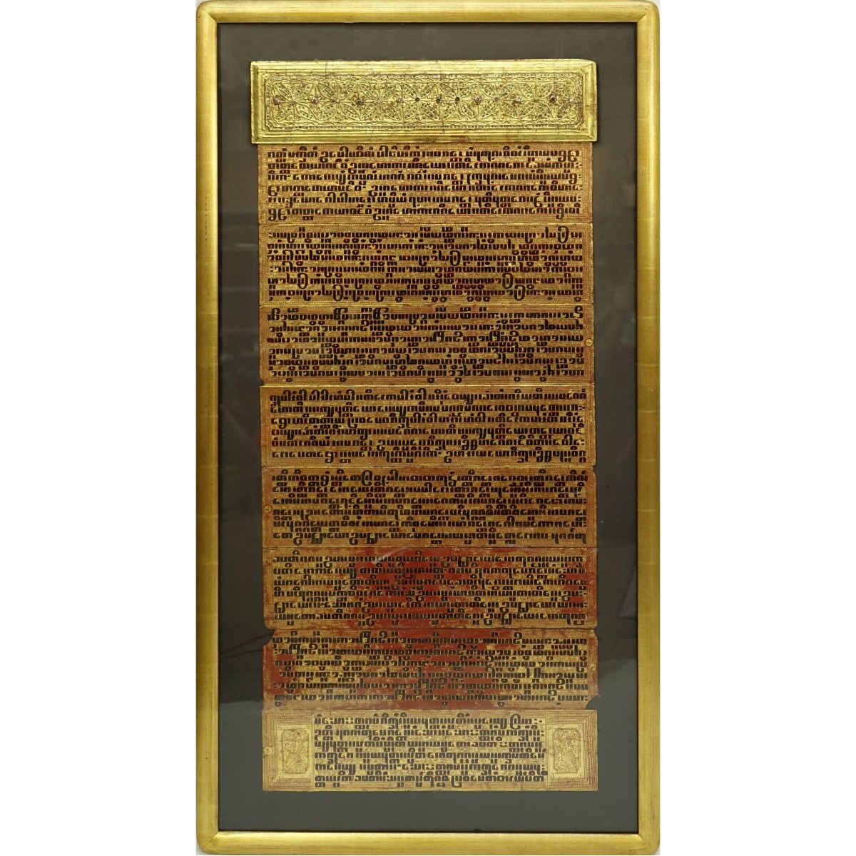 A Thai Buddhist Prayer Scroll Set in Frame with Giltwood Jeweled Mount. Sight measures 42" H x 22" W, frame measures 55-5/8" H x 30-1/4" W Domestic Shipping: Third party Min Est. $100.00 Max Est. $200.00