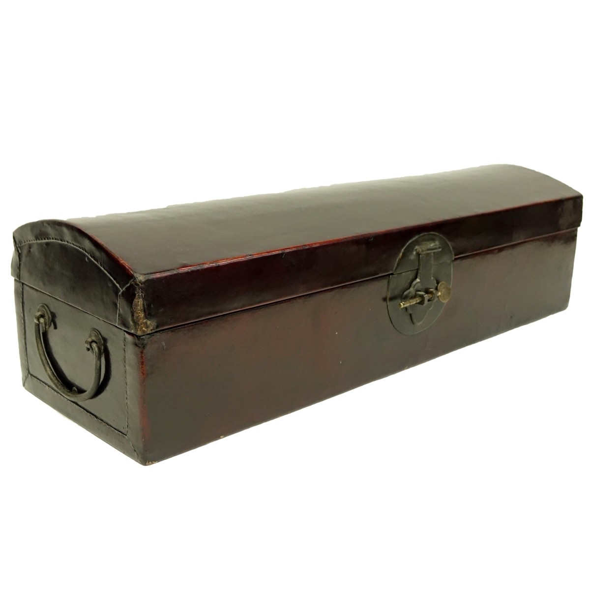 Antique Chinese Lacquered Leather Scroll Box. With key. Unsigned. Measures 6-7/8" H x 25-1/4" L x 8-1/4" Condition: Some wear and lifting on the interior. Domestic Shipping: $85.00 Min Est. $200.00 Max Est. $300.00