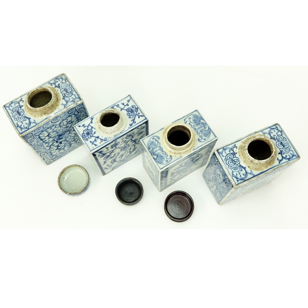 Four (4) Antique Chinese Blue & White Porcelain Tea Caddies. Various designs. Two with later associated lids. Unsigned. Largest measures 6" H. Condition: Overall good condition with minor wear from age and use. Domestic Shipping: $65.00 Min Est. $200.00 Max Est. $400.00