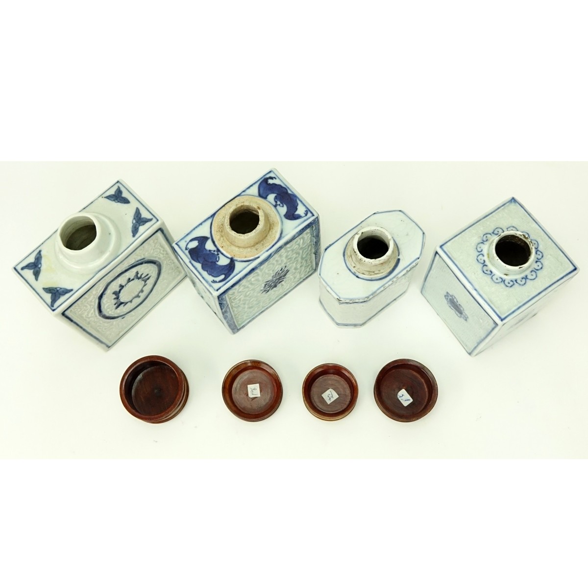 Four (4) Antique Chinese Blue & White Porcelain Tea Caddies. Various designs. Later associated lids. Unsigned. Largest measures 5-1/2" H. Condition: Overall good condition with minor wear from age and use. Domestic Shipping: $62.00 Min Est. $400.00 Max Est. $600.00
