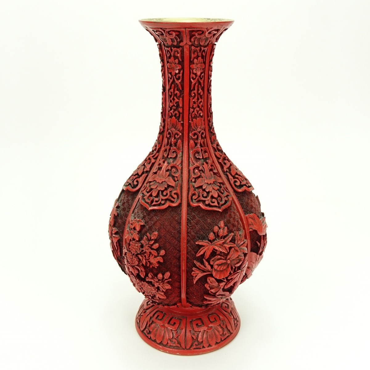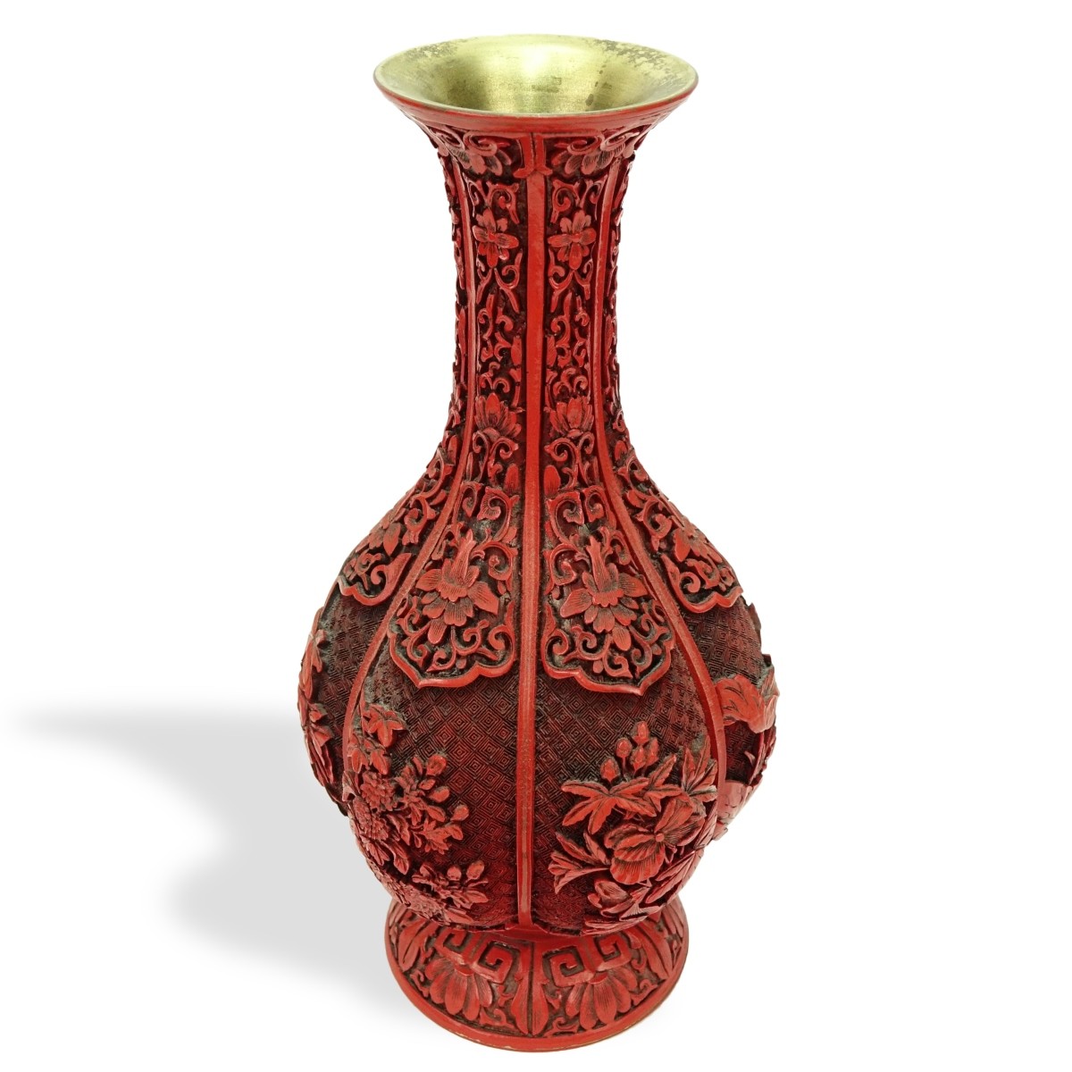 Chinese Cinnabar Vase With Brass Interior. Decorated with carved floral motif. Unsigned. Measures 12-1/4" H. Condition: Good condition. Domestic Shipping: $58.00 Min Est. $50.00 Max Est. $100.00