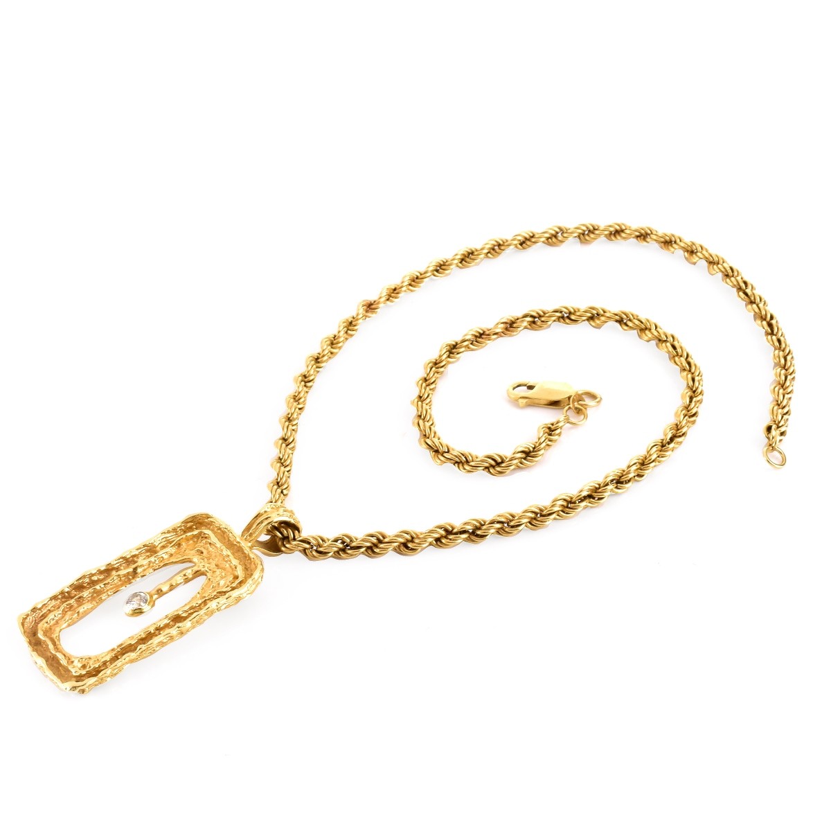 Vintage Round Brilliant Cut Diamond and 14 Karat Yellow Gold Pendant and Rope Link Necklace. Stamped 14K. Pendant measures 1-3/4" L, 7/8" W; chain measures 18" L. Approx. total weight: 22.0 grams. Condition: Good vintage condition. Domestic Shipping: $30.00 Min Est. $400.00 Max Est. $500.00