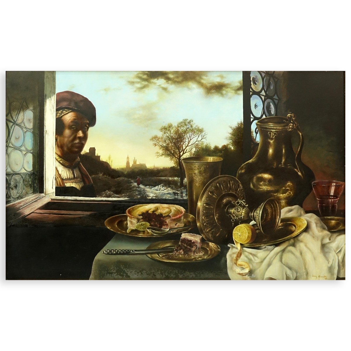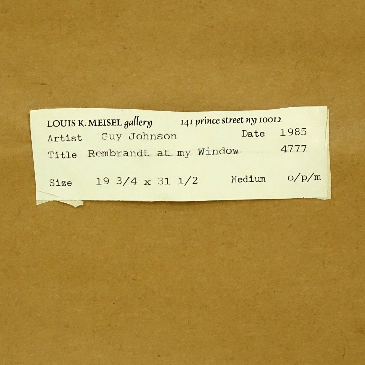 Guy Johnson, American (b. 1927) Oil on Paper on board "Rembrandt At My Window", Dated 1985. Signed. Gallery tag en verso from Louis K. Meisel Gallery, NY. Measures 19-3/4" x 31-1/2", frame measures 26" x 38". Condition: Good condition. Domestic Shipping: Third party. Min Est. $1500.00 Max Est. $2000.00