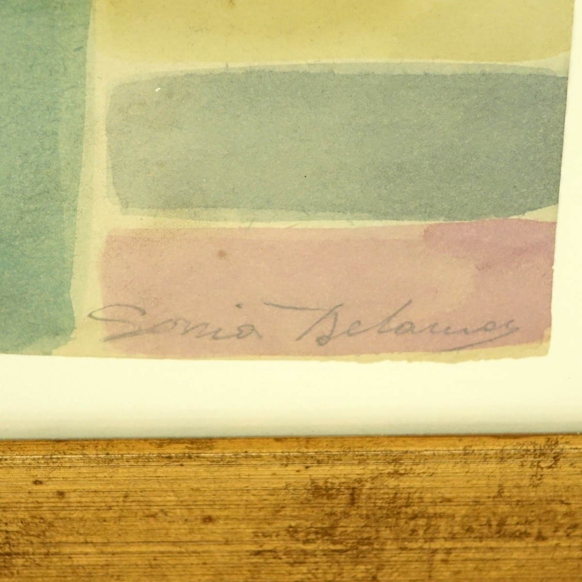 Attributed to: Sonia Delaunay, French (1885-1979) wayercolor on paper "Color Composition". Signed lower right in pencil. Measures 18-1/4" x 12", frame measures 24-3/4" x 20-3/4". Condition: Toning from age, foxing, stains some rough edges. Affixed to mat board. Domestic Shipping: $155.00 Min Est. $600.00 Max Est. $800.00