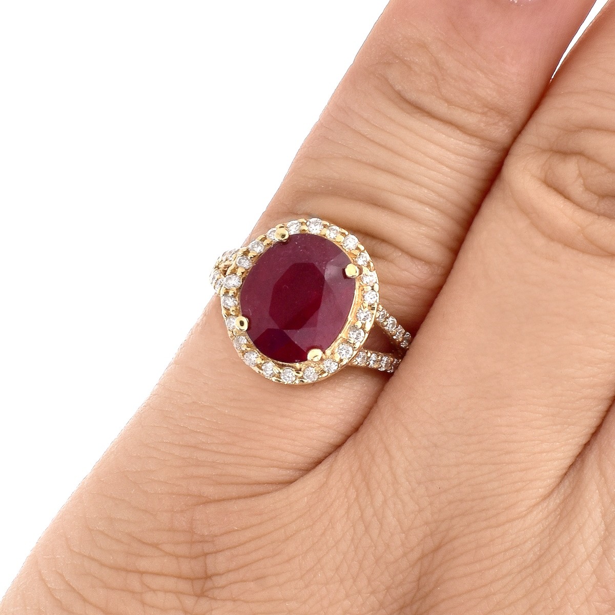 Glass Filled Oval Cut Ruby, Diamond and 14 Karat Yellow Gold Ring. Ruby with vivid color, measures 11mm x 9mm. Stamped 14K. Approx. weight: 6.1 grams. Condition: Very good condition. Domestic Shipping: $28.00 Min Est. $100.00 Max Est. $200.00