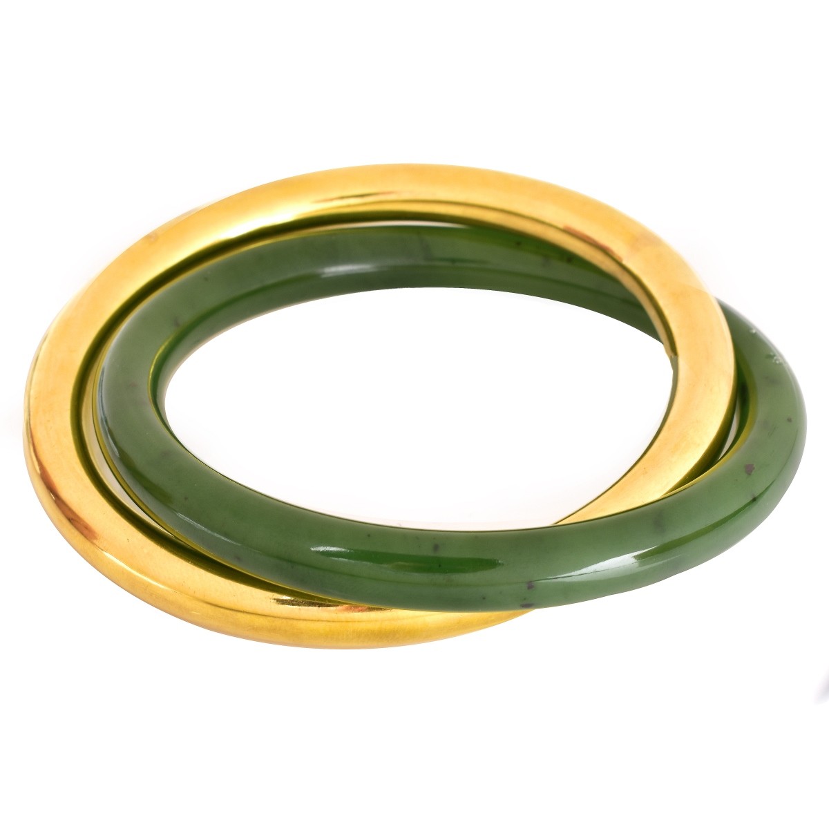 Vintage Tiffany & Co Interlocking 18 Karat Yellow Gold and Jadeite Jade Bangle Bracelets. Gold bangle stamped T&Co 18KT. Measure 1/4" W, 2-5/8" interior diameter. Approx. total weight: 82.4 grams. Condition: Very good condition. Domestic Shipping: $32.00 Min Est. $7000.00 Max Est. $9000.00