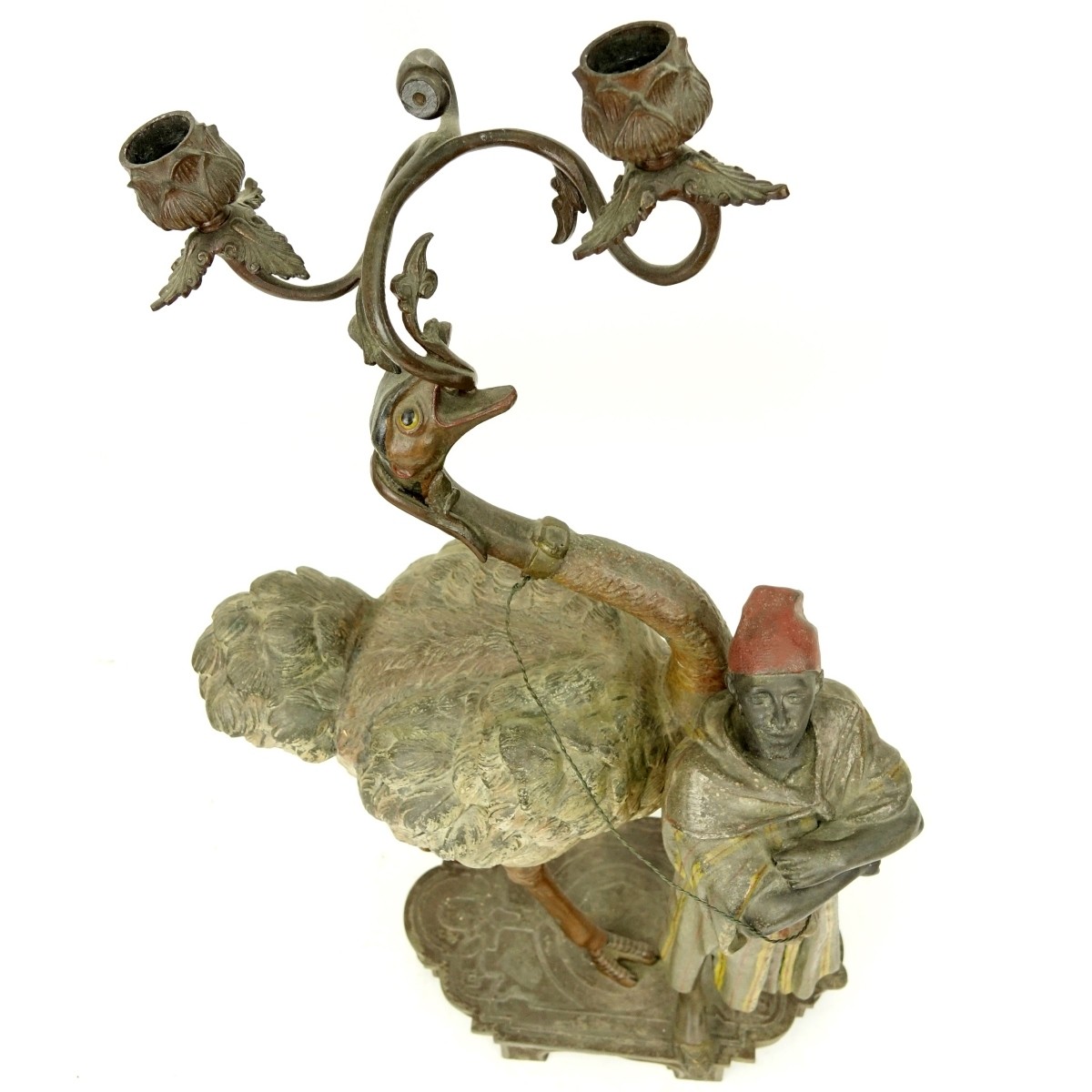 19th Century French Polychrome Spelter Orientalist Two Arm Candelabrum, Arab Male with Ostrich, Unsigned. Measures 24" H x 13" W. Condition: Rubbing, wear Domestic Shipping: Third party Min Est. $300.00 Max Est. $500.00