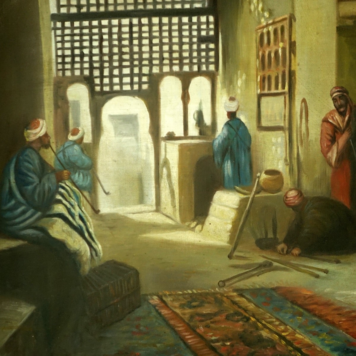 Modern Orientalist School Oil On Canvas "The Pipe Smokers" Signed Aban Hirmas lower right. Measures 22" x 26". Condition: Good condition. Domestic Shipping: $125.00 Min Est. $100.00 Max Est. $150.00