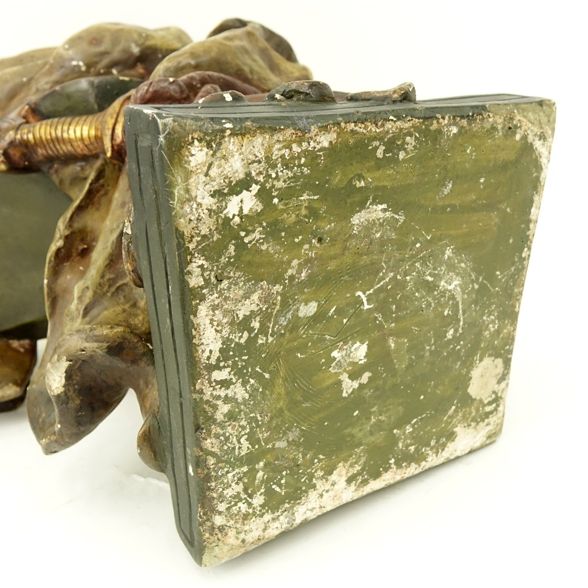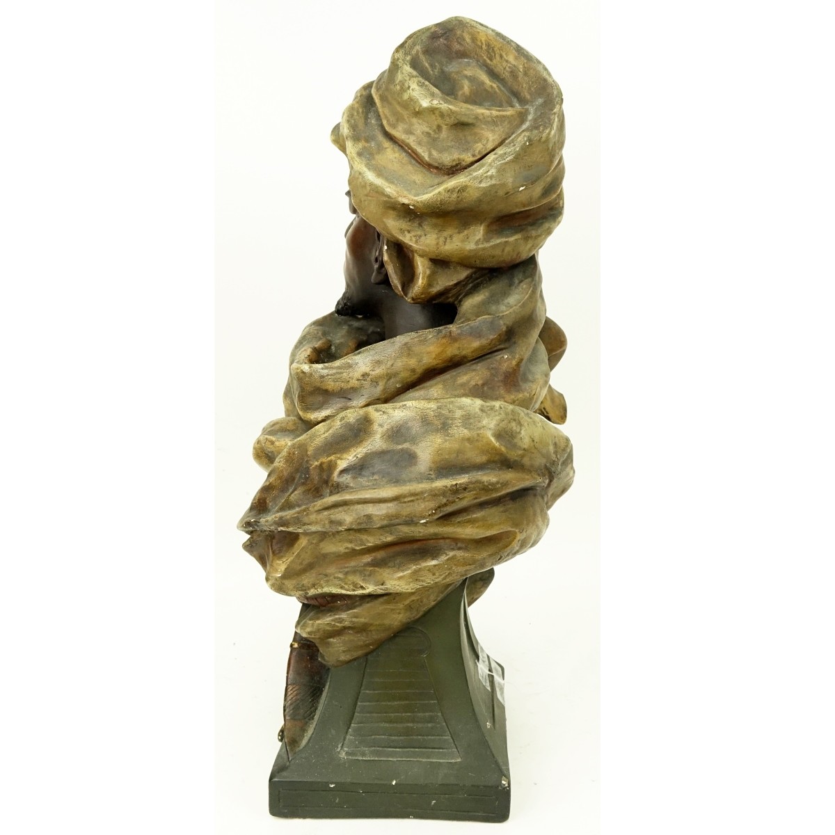 Vintage Orientalist Polychrome Pottery Bust of a Male. Unsigned. Measures 25-3/4" H x 16-1/4" W. Condition: Nicks, chips and rubbing Domestic Shipping: Third party Min Est. $400.00 Max Est. $600.00