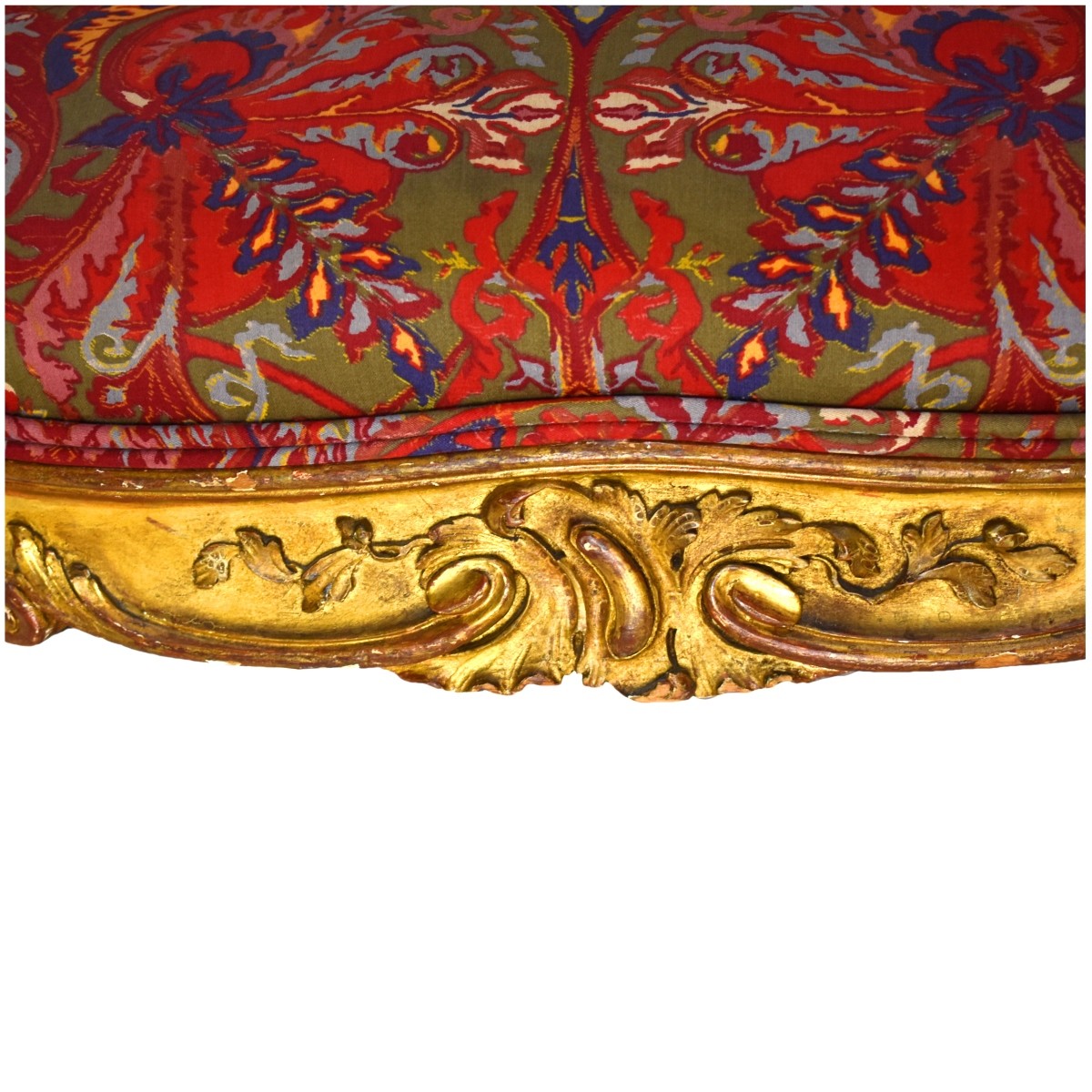 19th Century Louis XVI Style Barrel Back Carved and Upholstered Bergere Chair. Measures 30-3/8" H x 31-1/2" W. Condition: Splits to frame, scratches Domestic Shipping: Third party Min Est. $800.00 Max Est. $1200.00