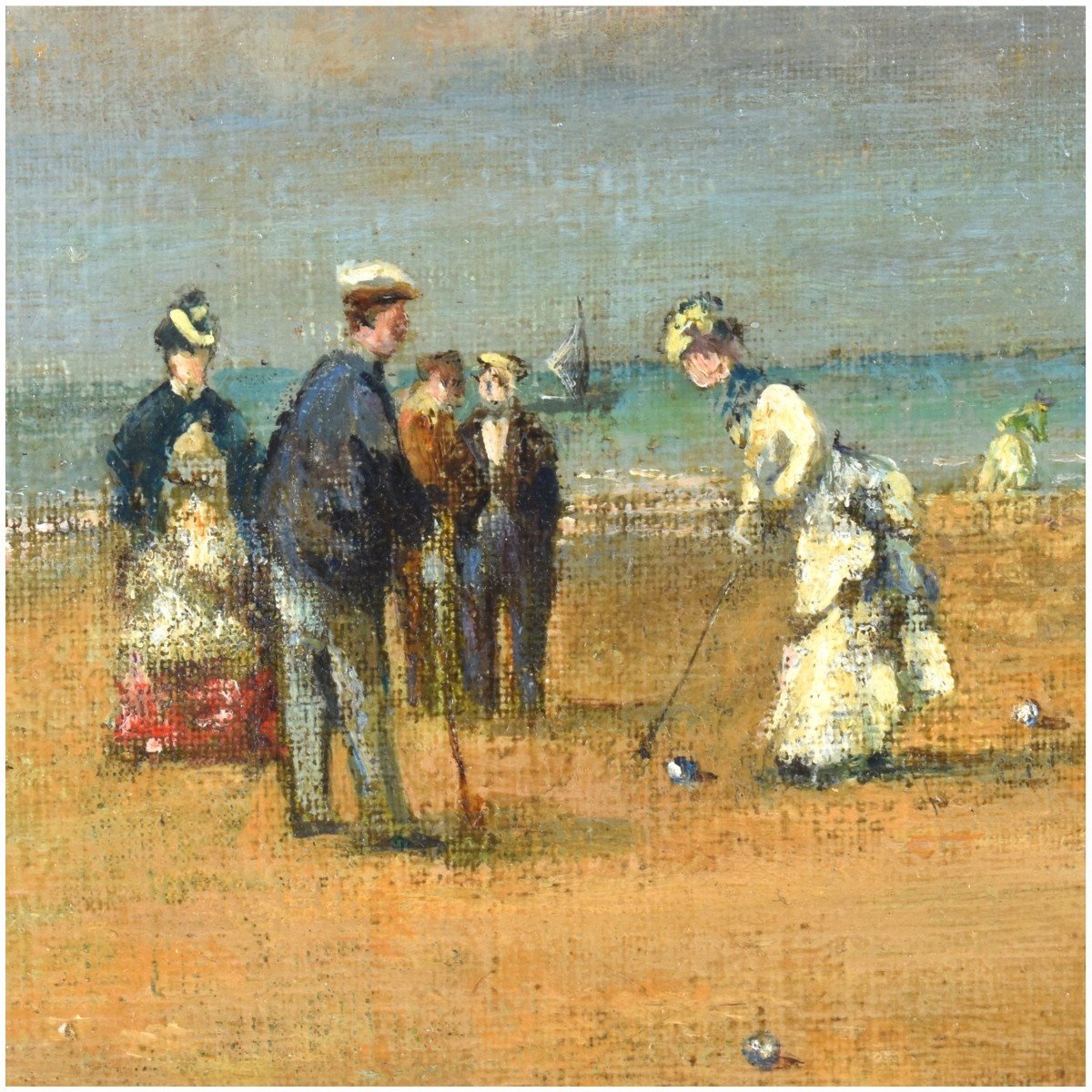 Circle of: Eug-ne Baudin, French (1843 - 1907) Oil on Canvas "The Beach at Trouville" Signed Lower Left. Label attached en verso. Measures 14-3/8" H x 20-7/8" W, frame measures 20-1/2" H x 26-1/2" W. Condition: Good conserved condition Domestic Shipping: $165.00 Min Est. $10000.00 Max Est. $15000.00