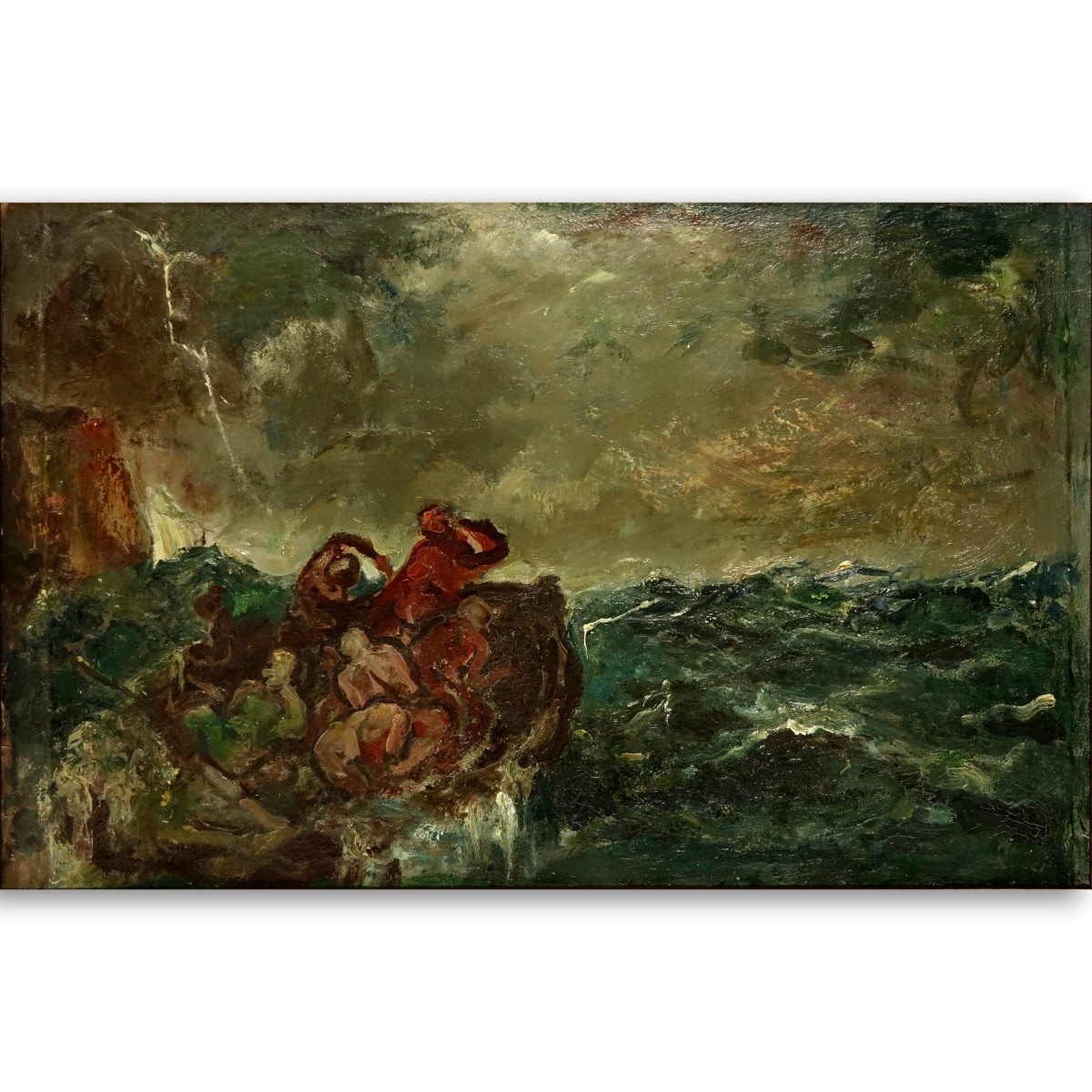 Mario Bucci, Italian (1903 - 1970) Oil on Canvas "Storm At Sea". Signed lower right. Measures 16" x 25-3/4", frame measures 20" x 29-3/4". Condition: Some craquelure. Domestic Shipping: $125.00 Min Est. $400.00 Max Est. $600.00 Relist: NS 8.15.18#111 %