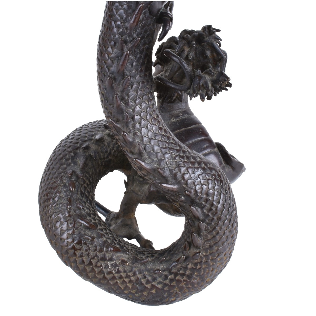 Two (2) Chinese Bronze Dragon Figural Candlesticks. Unsigned. Measures 11-3/4" H, smaller measures 11-1/8" H. Condition: Good condition Domestic Shipping: $115.00 Min Est. $100.00 Max Est. $150.00