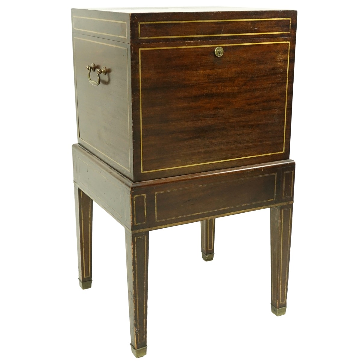 Antique Benson and Hedges Mahogany Humidor with Stand. Tag affixed on interior. Brass Lining throughout the exterior surface with brass inlaid top marked "JDM", tin lining on interior. Measures 32" H x 18" W x 17" D. Domestic Shipping: Third party Min Est. $300.00 Max Est. $500.00