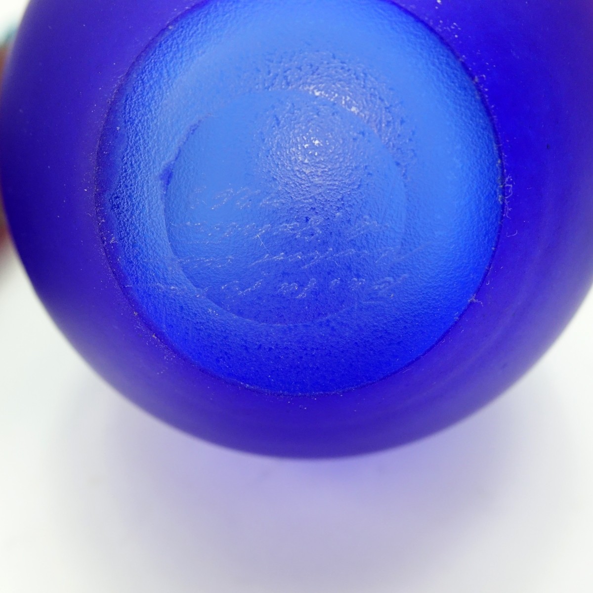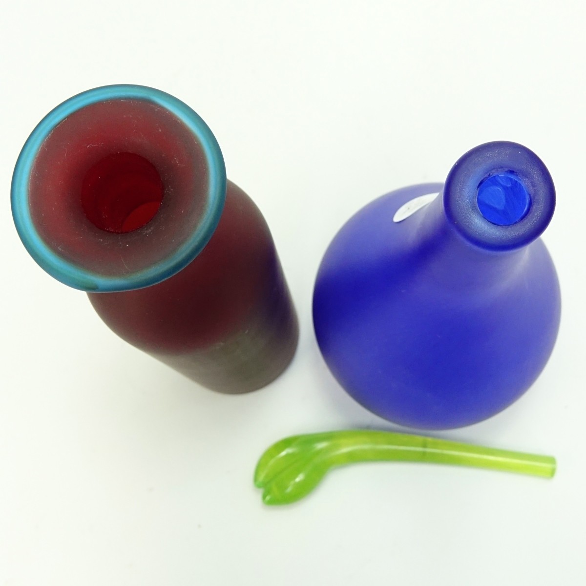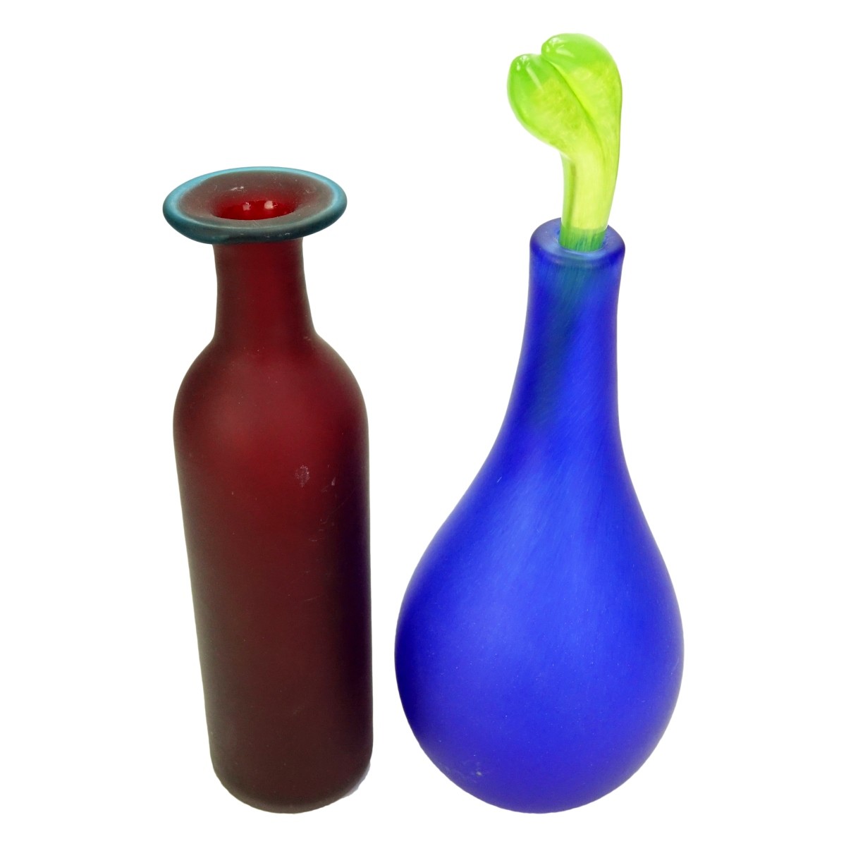 Grouping of Two (2) Art Glass Vases. Includes: Gunnel Sahlin for Kosta Boda decanter and Vintage colored bottle. Kosta Boda vase is signed, bottle is unsigned. Decanter measures 11-3/4" H, bottle measures 9-3/8" H. Domestic Shipping: $68.00 Min Est. $50.00 Max Est. $100.00