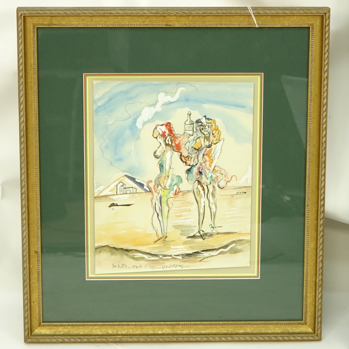 Alfred Gwynne Morang, American (1901 - 1958) Watercolor Gouache on Paper "Abstract: For Kitty" Signed and inscribed Lower Left. Inscribed en verso. Measures 11" H x 8-7/8" W, frame measures19-3/4" H x 17-1/4" W. Domestic Shipping: $115.00 Min Est. $300.00 Max Est. $500.00