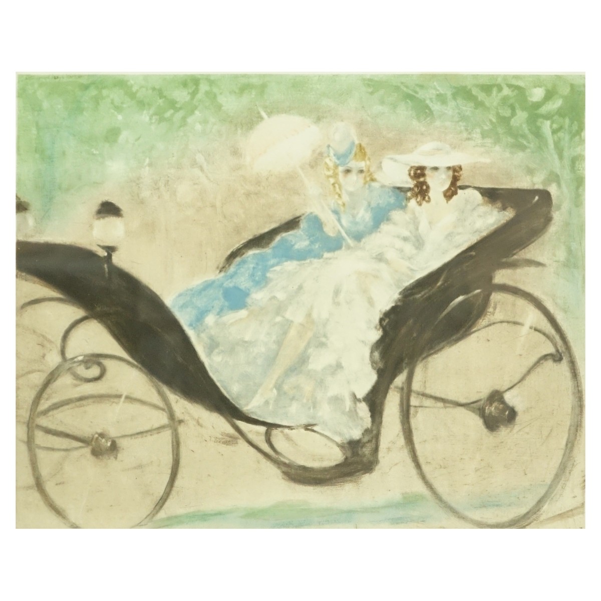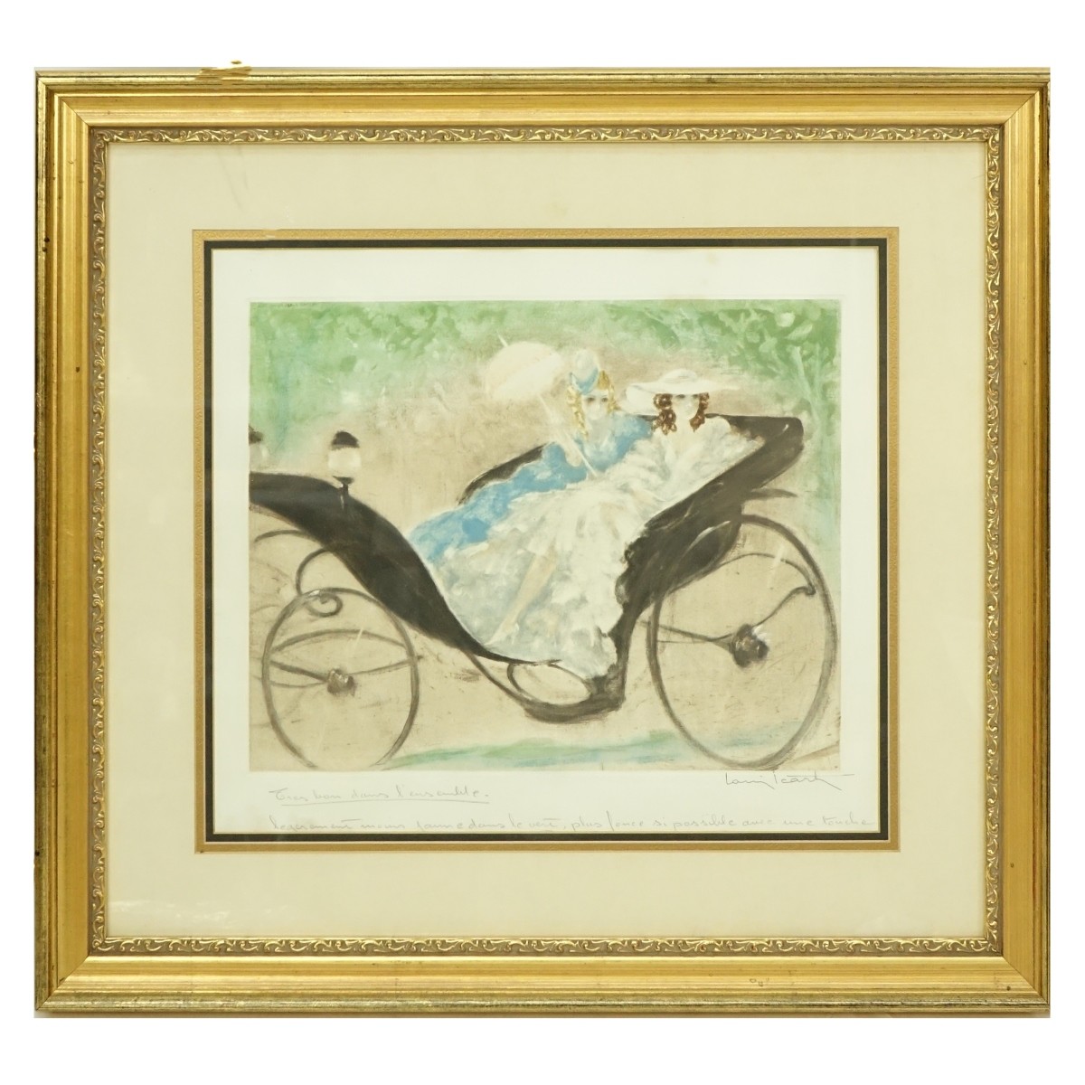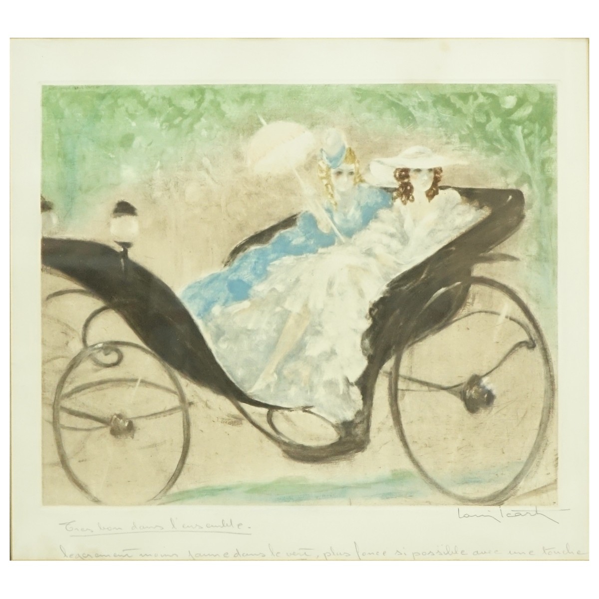 After: Louis Icart, French (1888 - 1950) Etching, Young Women In An Open Carriage, Pencil Signed Lower Right. Inscribed in French on lower margin. Copyright mark in the plate. Measures 16" H x 17-1/2" W, frame measures 25-3/8" H x 27-1/4" W. Domestic Shipping: Third party Min Est. $700.00 Max Est. $900.00