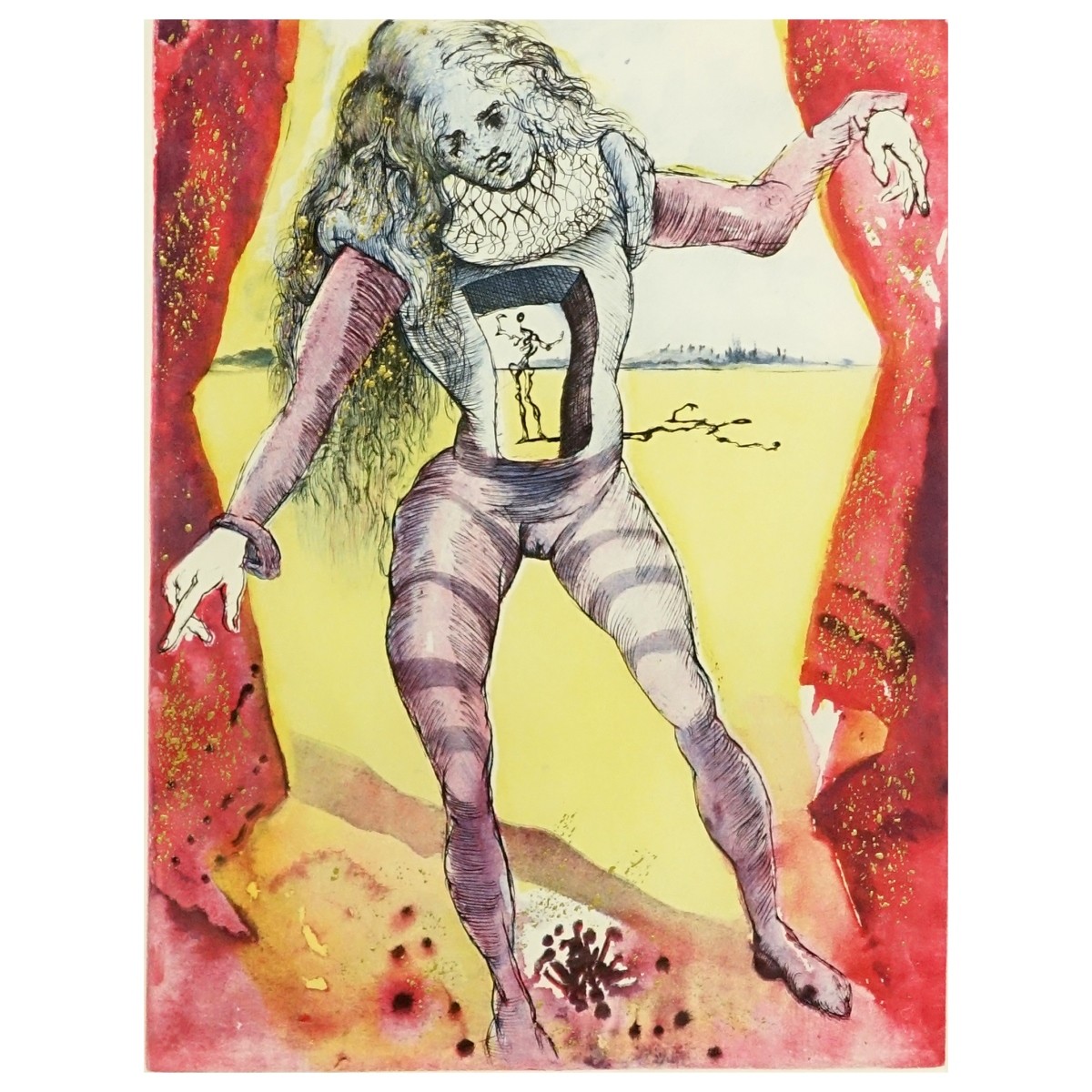 Salvador Dali, Spanish/French (1904 - 1989) Etching with Coloring "Hamlet 1973" Signed and Numbered 49/147 on Lower Margin. Blind stamp lower left. Measures 22-1/2" H x 16" W, frame measures 35-3/4" H x 29-1/4" W. Domestic Shipping: Third party Min Est. $500.00 Max Est. $750.00